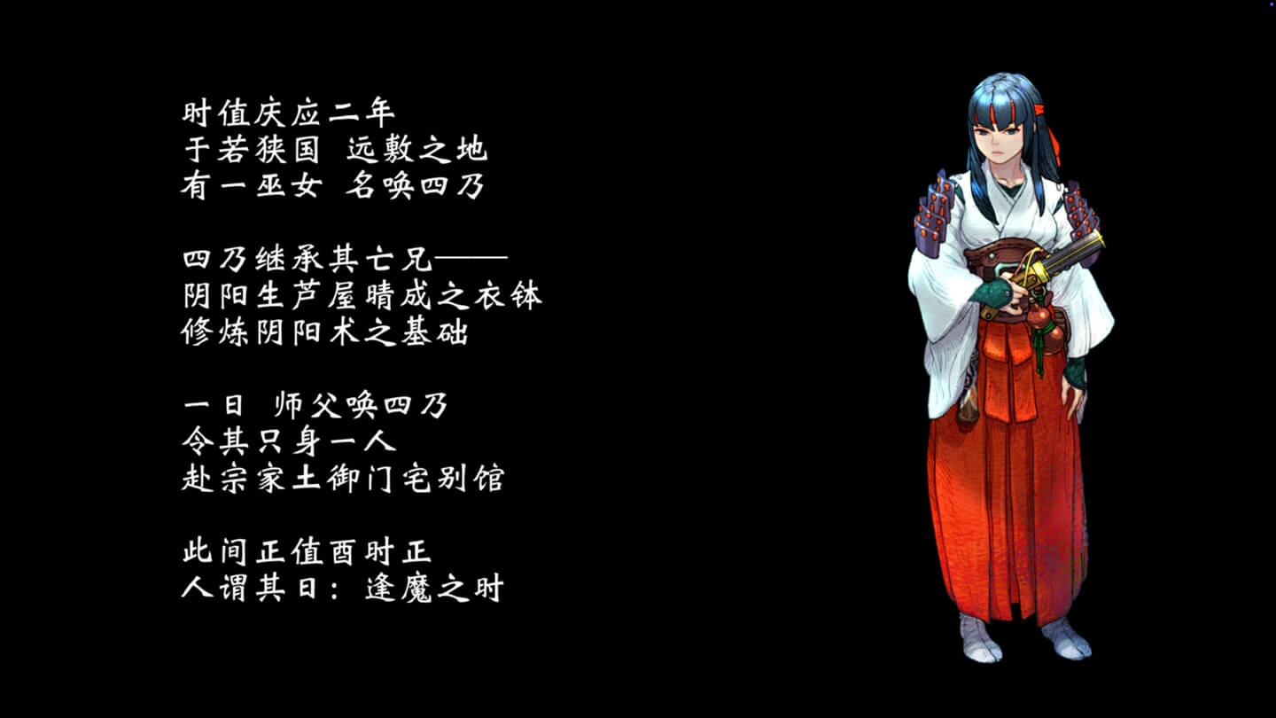 巫女四乃追寻着行踪不明的阴阳师兄长的踪迹。兄长所到之处是妖魔(妖怪和怨灵等)的巢穴,每次进入,鬼屋的结构都会发生变化,是一个非常可怕的地方。游戏模式包括“祓(除厄)”、“禊(净心)”、“行(修业)”三种。其中,”行”模式是在挑战在无尽迷宫里考验生存能力的最高难度模式。