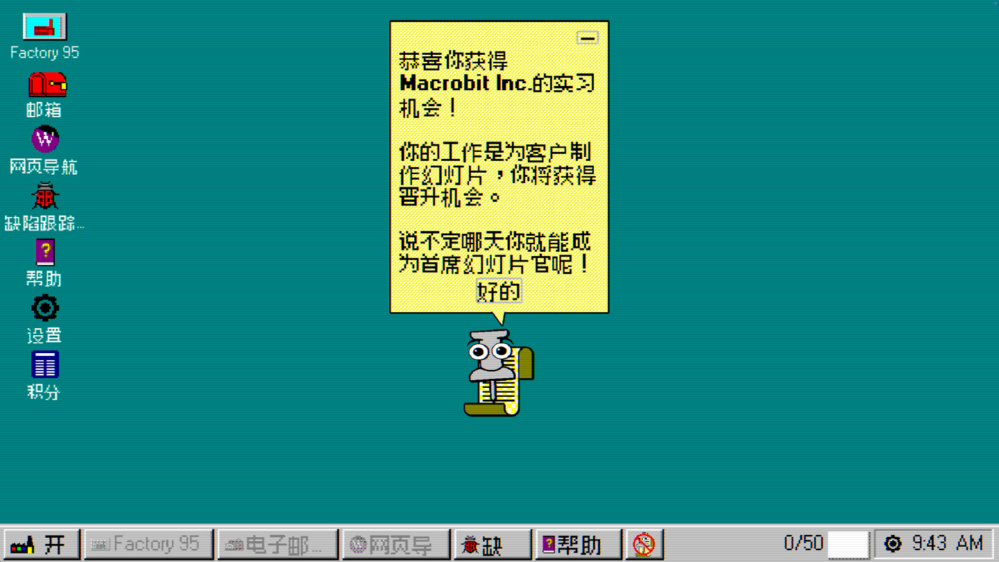 Factory 95 是一款复古 Windows 风格的自动化游戏,关于在幻灯片中建造一个幻灯片工厂!在这款极简的工厂建造游戏中,你需要管理空间,制作越来越复杂的幻灯片,还要应对千年虫(Y2K)问题。