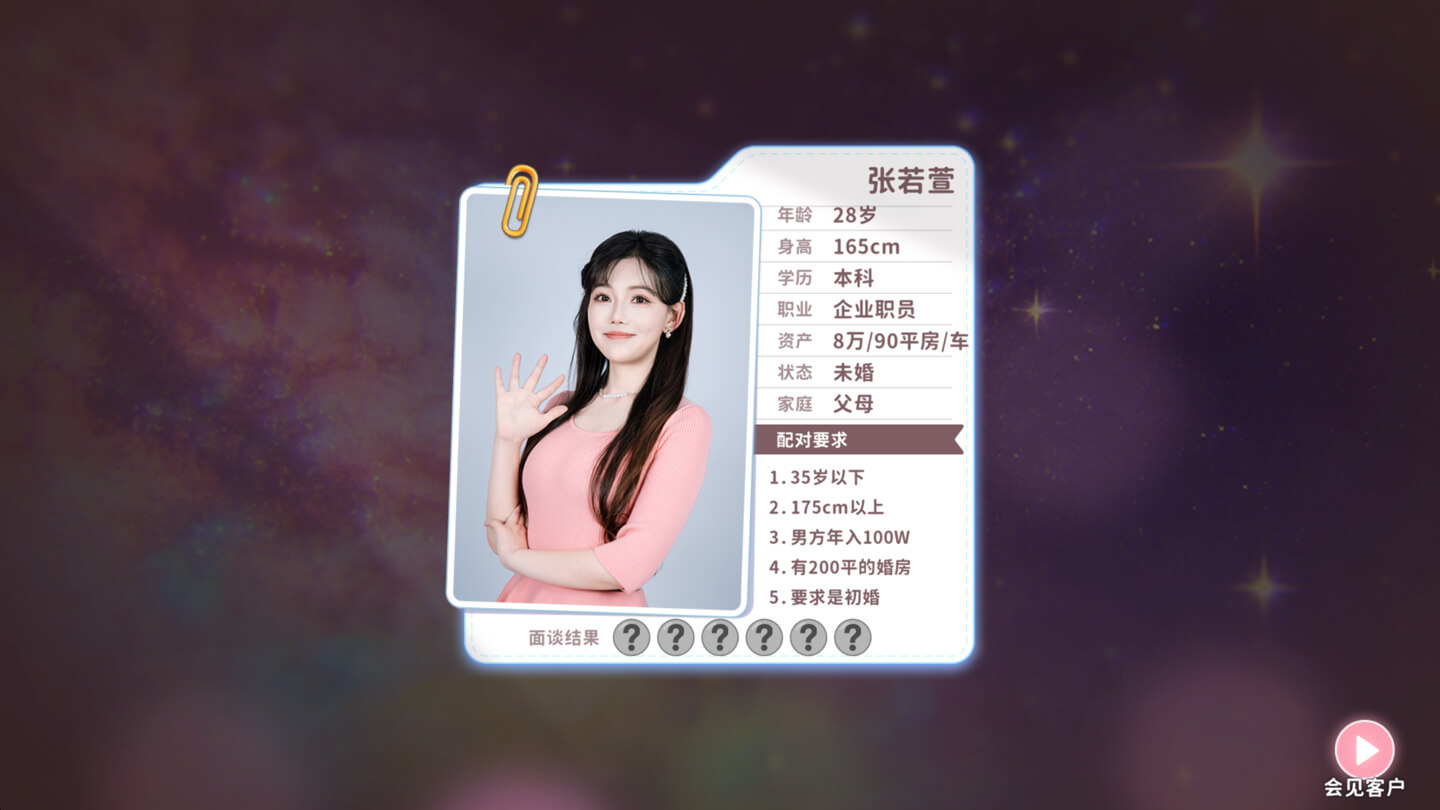 你的每一次选择都决定剧情走向 —— 是怼醒不切实际的择偶幻想,还是帮客户找到势均力敌的缘分?直面彩礼、房车、原生家庭等真实婚恋矛盾,解锁 N 种结局,亲手撮合良缘或见证遗憾,快来化身金牌红娘,搞定这些 “难搞” 客户,在啼笑皆非的观念碰撞中,探寻 “匹配” 的真正意义!