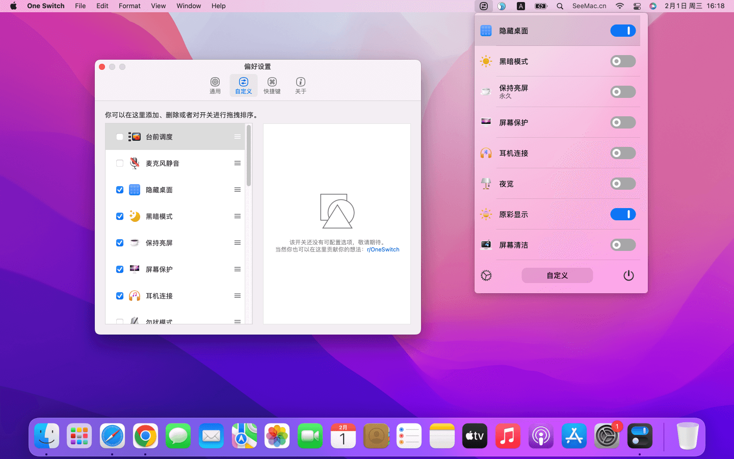 👍 系统功能一键开关工具 软件介绍 One Switch 是一款mac平台上面的快速开启或关闭系统功能的工具。比如一键隐藏mac桌面图标、一键切换mac深色外观(暗黑模式)、一键关闭Mac休眠、一键开启mac屏幕保护、一键连接AirPods等、一键显示mac隐藏文件、一键打开mac原彩显示等等功能,您还可以自定义其它功能!