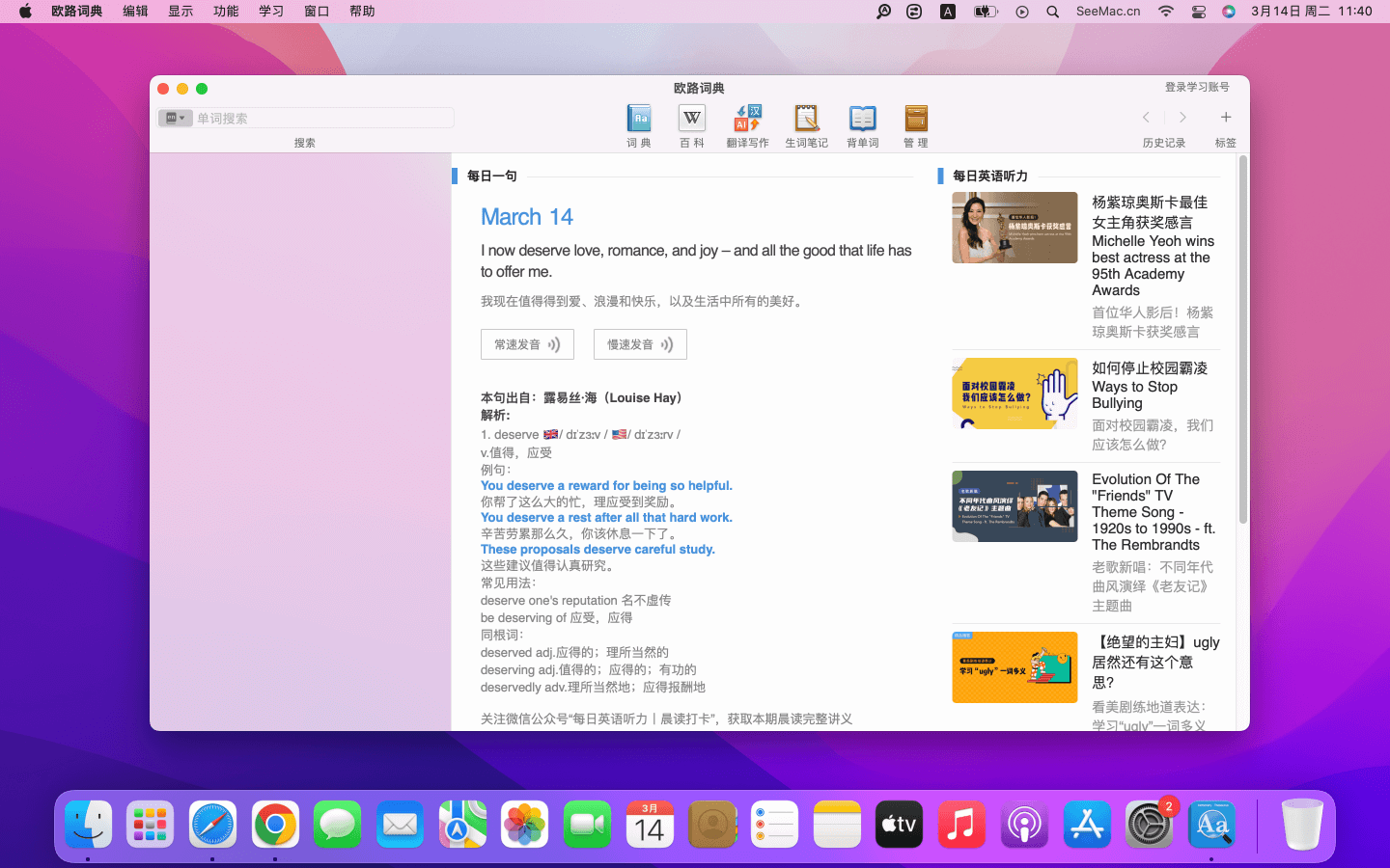 欧路词典 (Eudic) 是一款mac系统中强大又权威的词典软件,内置常用英汉词条30多万个,专业词条40万个;支持加载MDict、灵格斯、Babylon等多种词典格式;可以打开众多网友制作的大量精美词典库;支持百度、有道、American、Heitage等多部在线词典;提供免费词库编辑器,自行制作导入系统中的词库。另外还支持100余种其它语言的词典,支持屏幕截图翻译,划词搜索等功能,可以说是mac平台上最强大的词典软件了。