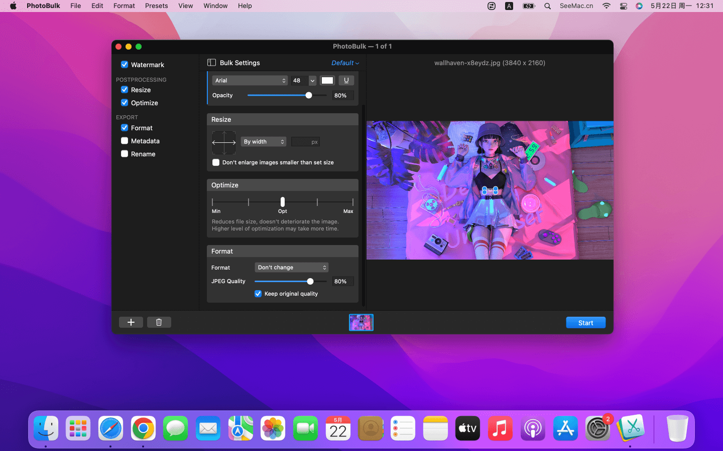 PhotoBulk 是一款mac 平台上的图片批量处理工具,它可以对图片进行批量修改格式、批量压缩、批量添加水印、批量调整尺寸、批量调整分辨率、批量重命名等操作。非常方便好用!