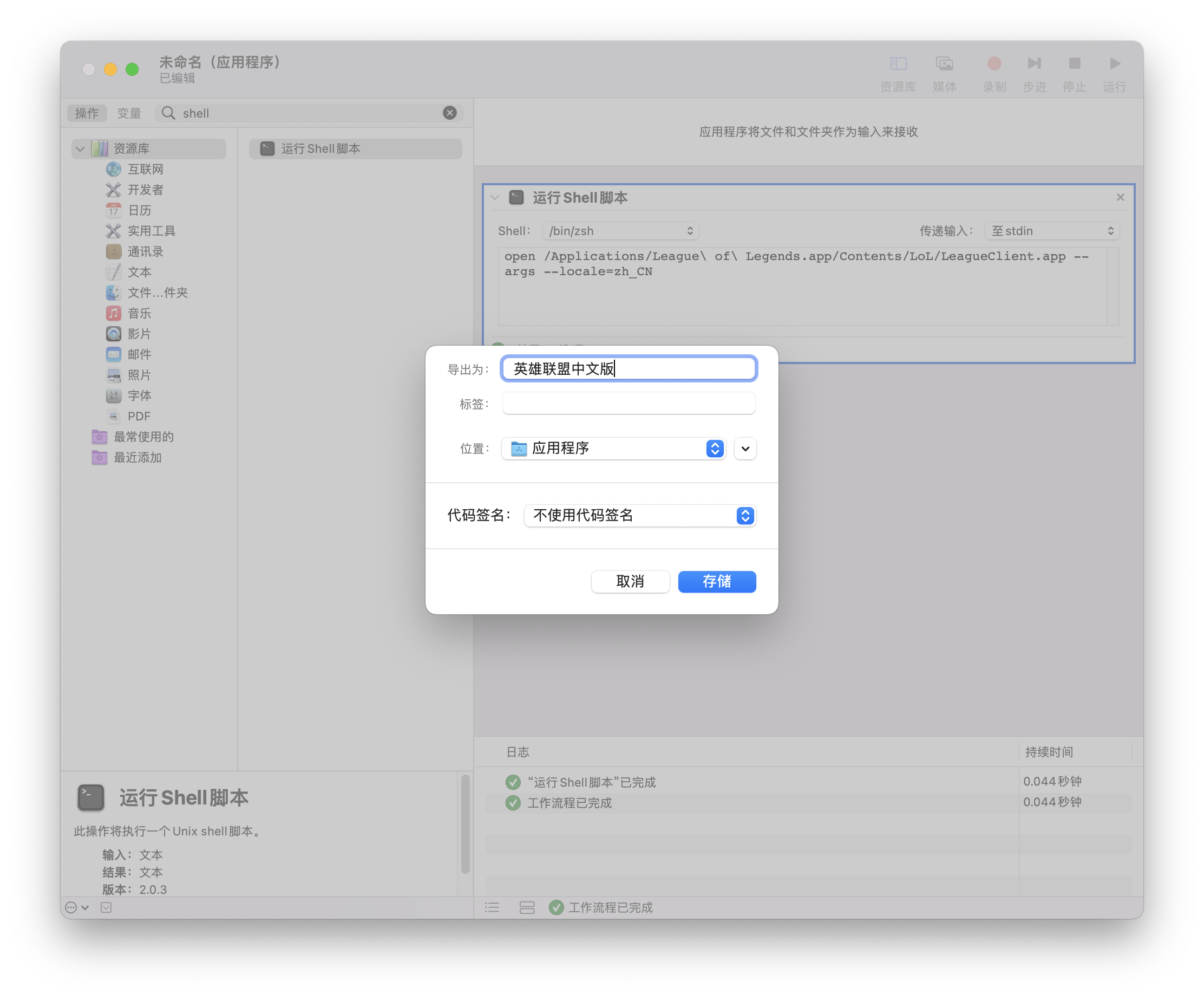 5.左上角顶部菜单栏点击 文件 -> 导出…,命名随意例如:英雄联盟中文版,位置选择 应用程序,点击 存储