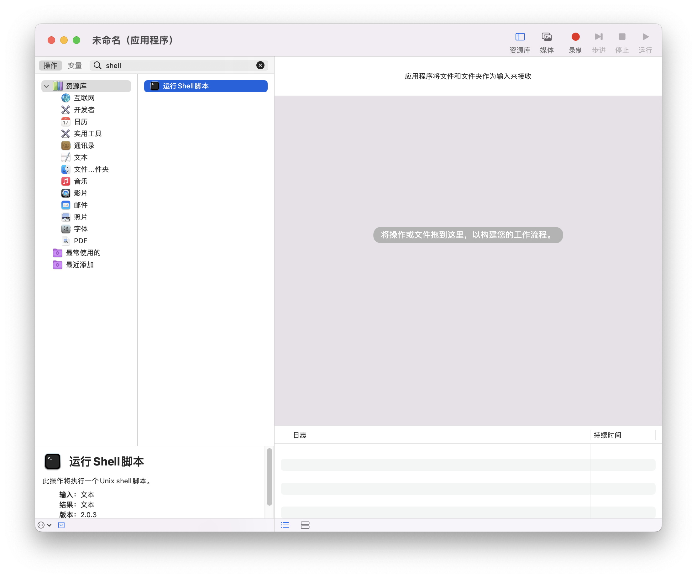 3.在左上角搜索栏输入 shell,然后双击 运行Shell脚本