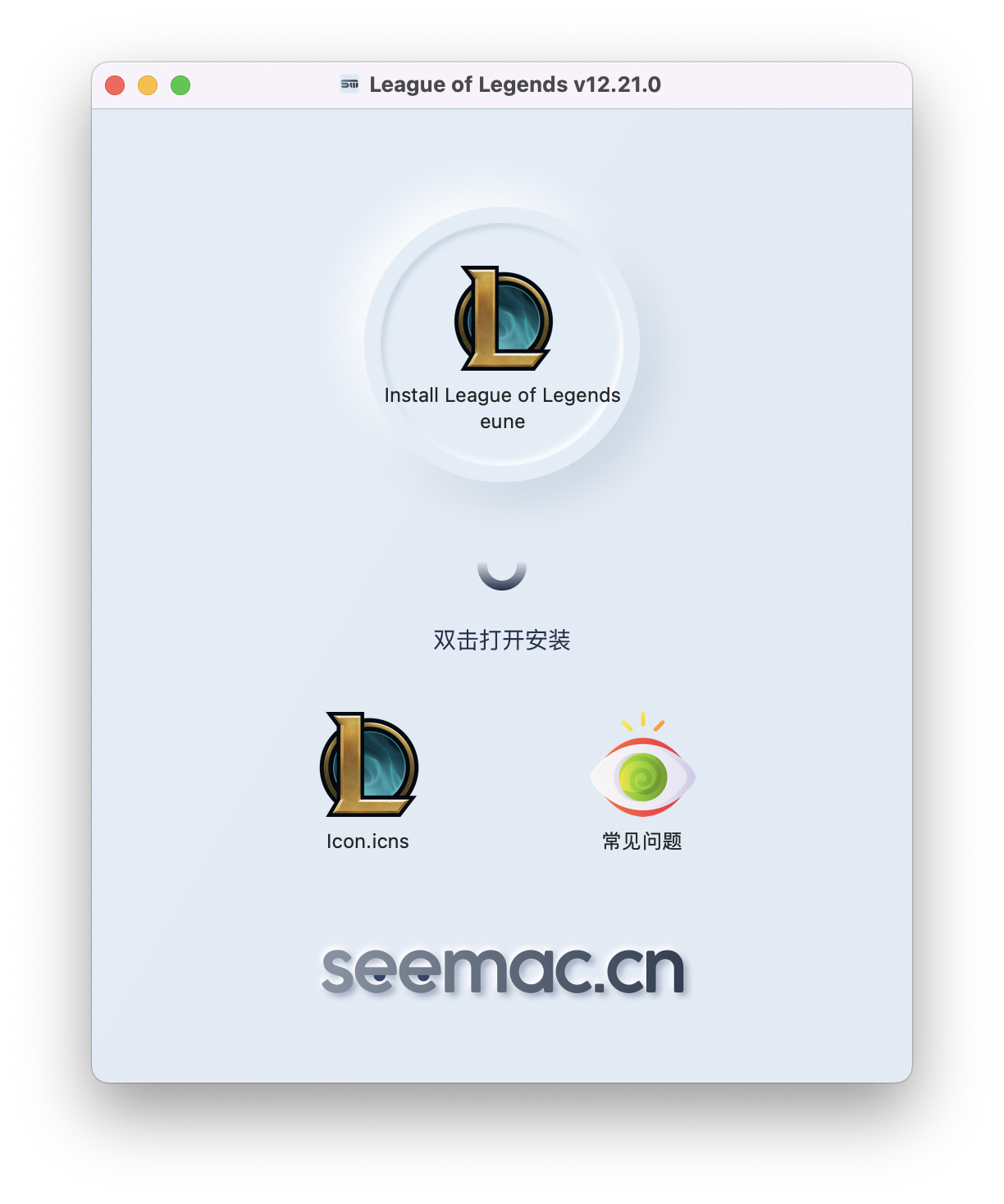 1.下载本站英雄联盟 for Mac打开后的安装界面如图,双击「Install League of Legends eune」进行安装