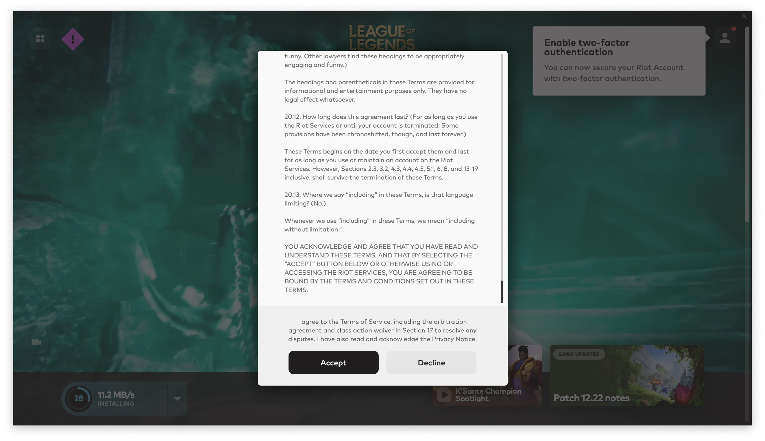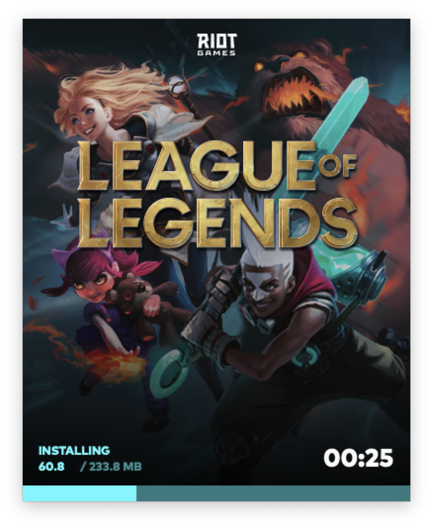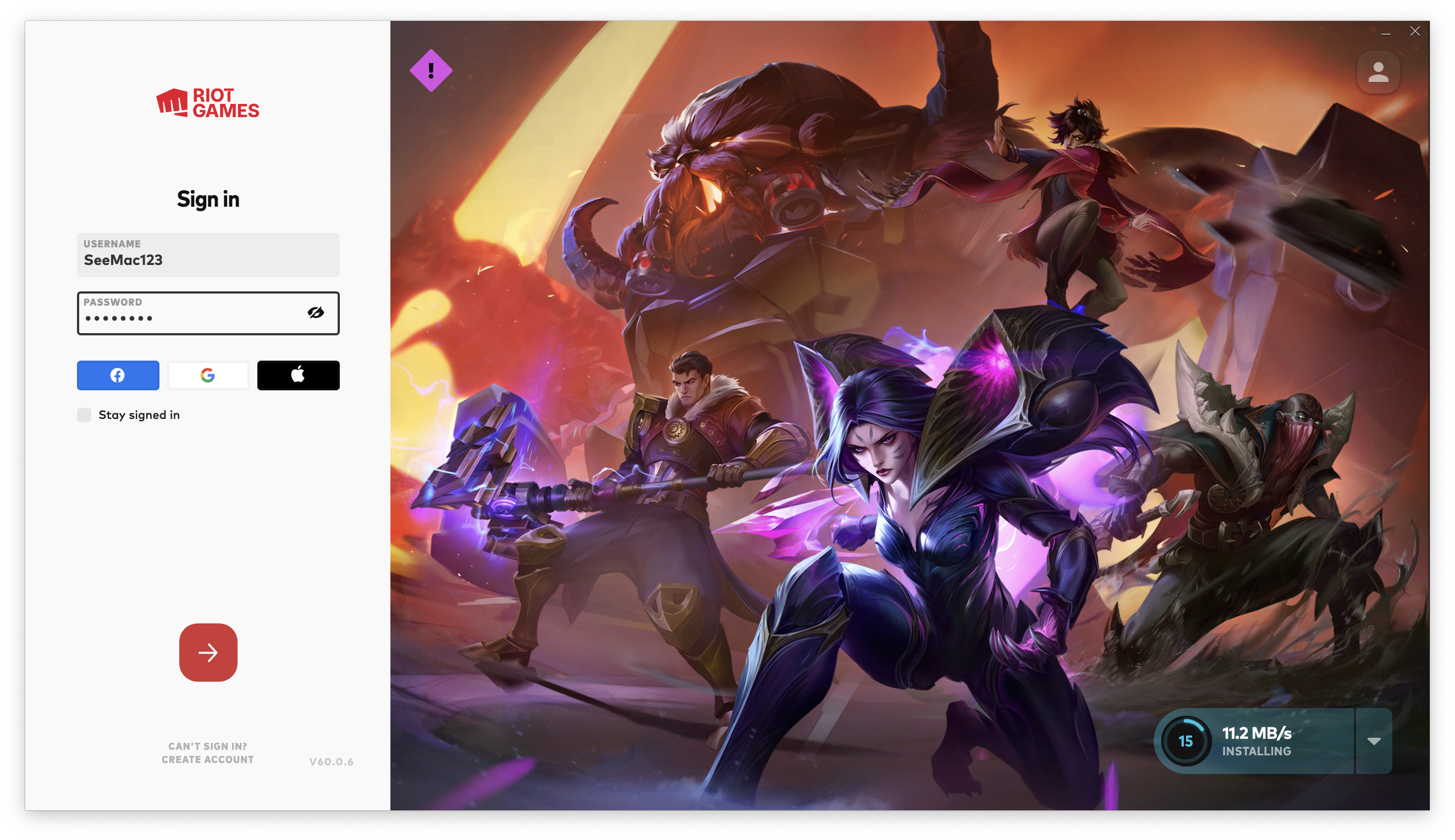 3.窗口右下角会显示安装进度,此时可以先登录账号,没有账号用谷歌或苹果账号登录,或者点击下方 CREATE ACCOUNT 去英雄联盟官网注册