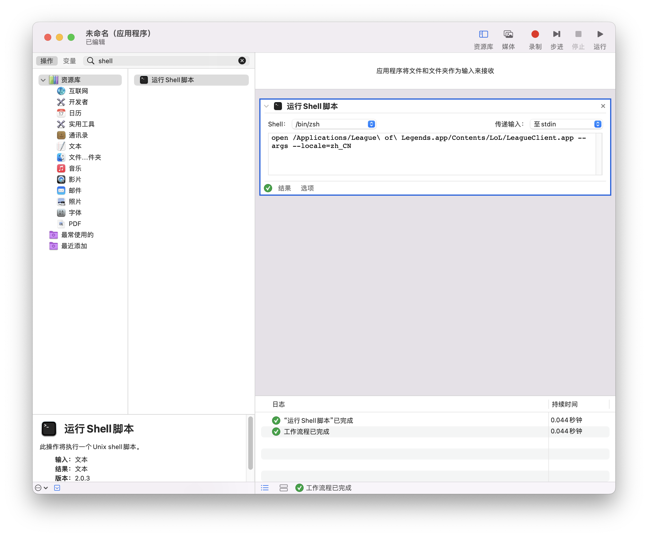 4.在右侧出现的窗口中输入以下命令,然后点击右上角运行,可以看到下方日志提示“运行Shell脚本”已完成」和「工作流程已完成」