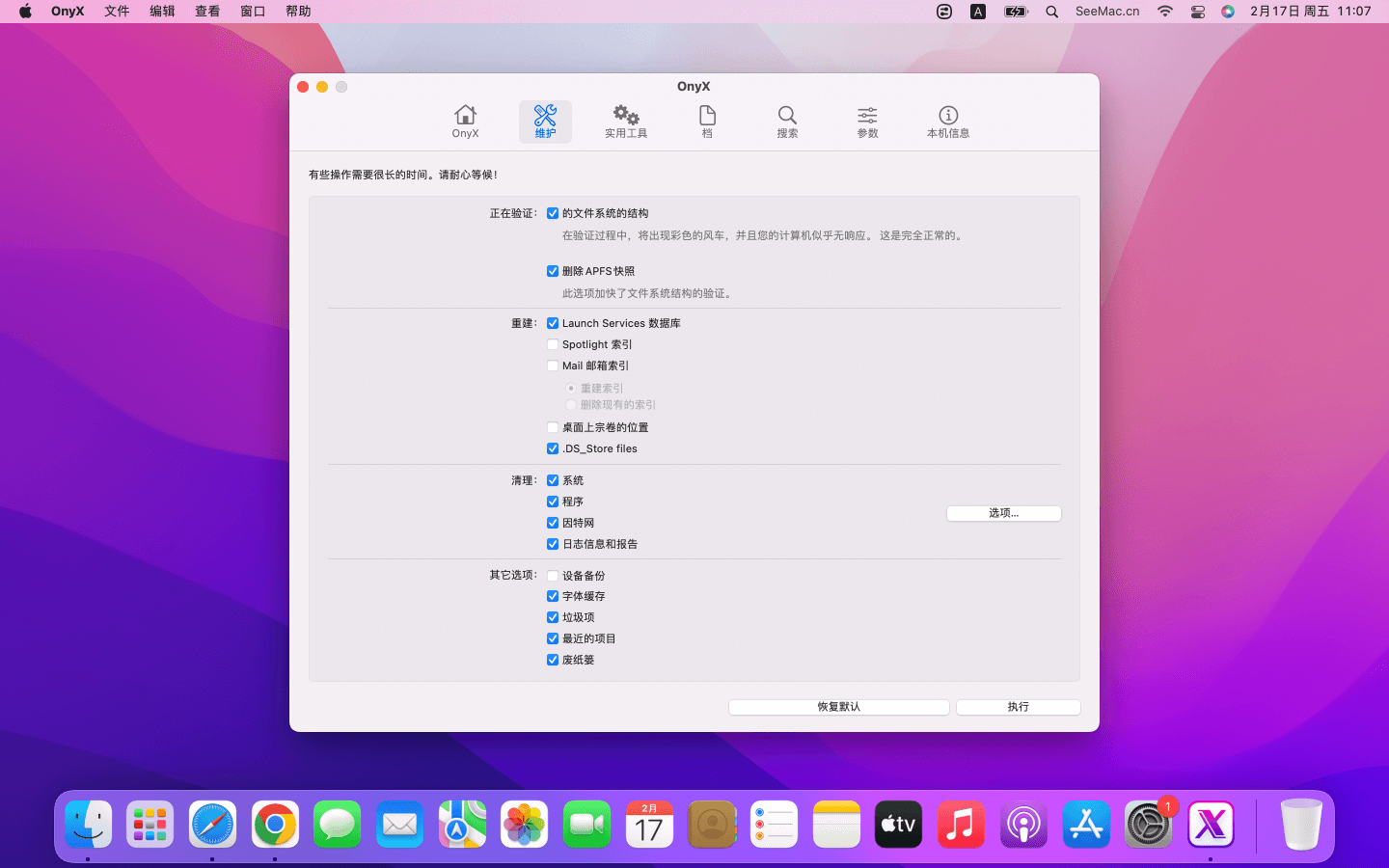 OnyX 是macOS X平台的一款多功能实用程序,可用于验证系统文件的结构,运行各种维护和清理脚本任务,定义Finder的窗口缩放、动画、显示路径、隐藏桌面图标等,自定义Dock栏,配置Safari和某些Apple应用程序中配置参数,还可以删除缓存,删除某些有问题的文件夹和文件,重建各种数据库和索引,查看硬件信息,管理/结束macOS进程等。