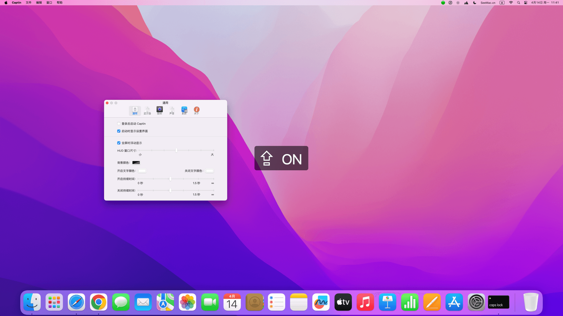 👍 大小写切换悬浮窗提示 软件介绍 Captin 是一款时实显示 macOS Caps 锁定状态的工具。每次按下中/英切换键(Caps)时会弹出一个透明的浮动窗口显示大写小状态,并且还有滴的一声提示。Captin 支持自定义窗口提示的显示位置、颜色、持续时间、大小以及声音。另外您可以在其设置中隐藏 Dock 栏和菜单栏的图标。