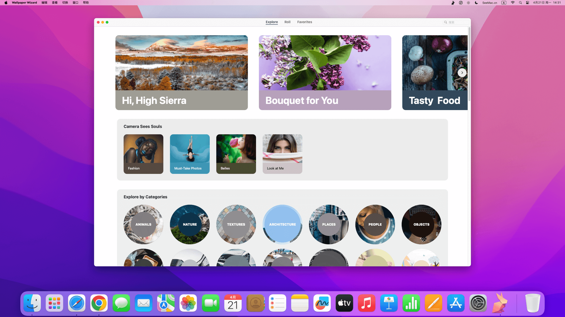 👍 超高质量桌面壁纸 软件介绍 挑一张养眼的桌面壁纸,是每个爱惜自己 Mac 的人的「小确幸」。Wallpaper Wizard 2 出现的目的,就是让你不花费太多时间与精力,就能收获这份快乐。 开发者宣称 Wallpaper Wizard 2 目前有 25000 张,且全部为高清的壁纸 (HD pictures),这就首先保证了在分辨率上不会亏待 Mac 的屏幕。其次在种类上按主题分为 14 类,每个大类下还有数十小类。基本覆盖了不同使用者的偏好。