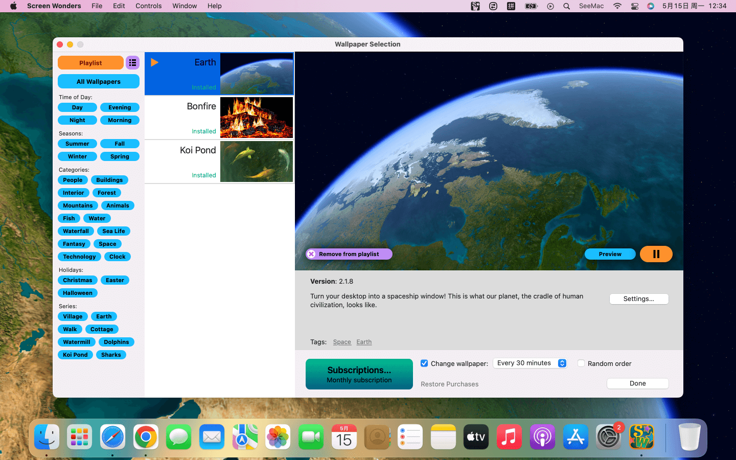 👍 高质量的动态视频壁纸 软件介绍 Screen Wonders 是一款高质量的 macOS 动态桌面壁纸应用。内置 18 款流畅漂亮的 5K 动态壁纸,包含:水族馆动态壁纸、异域建筑动态壁纸、钟摆动态壁纸、春夏秋冬四季风景动态壁纸。切换视频请在程序坞 Screen Wonders 图标上右键,点击Wallpaper Selection…,然后下载需要的即可。