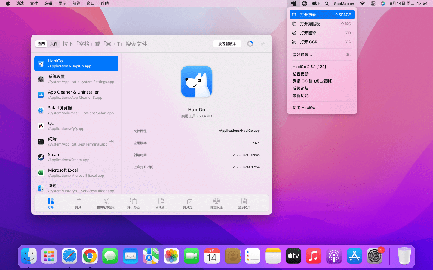 HapiGo 是一款 Mac 效率类应用,可以帮助您快速找到文件、打开应用程序、打开网页。支持文件预览和拼音搜索,速度更快,效率更高。HapiGo 首创的底部动作栏可快速对选中文件进行操作,比如:打开、复制、在访达中显示、复制路径、移动到、复制到、隔空投送、显示简介等。