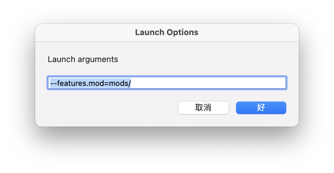 5.将输入框中默认的 –features.mod=mods/ 删除,然后复制以下命令粘贴到输入框