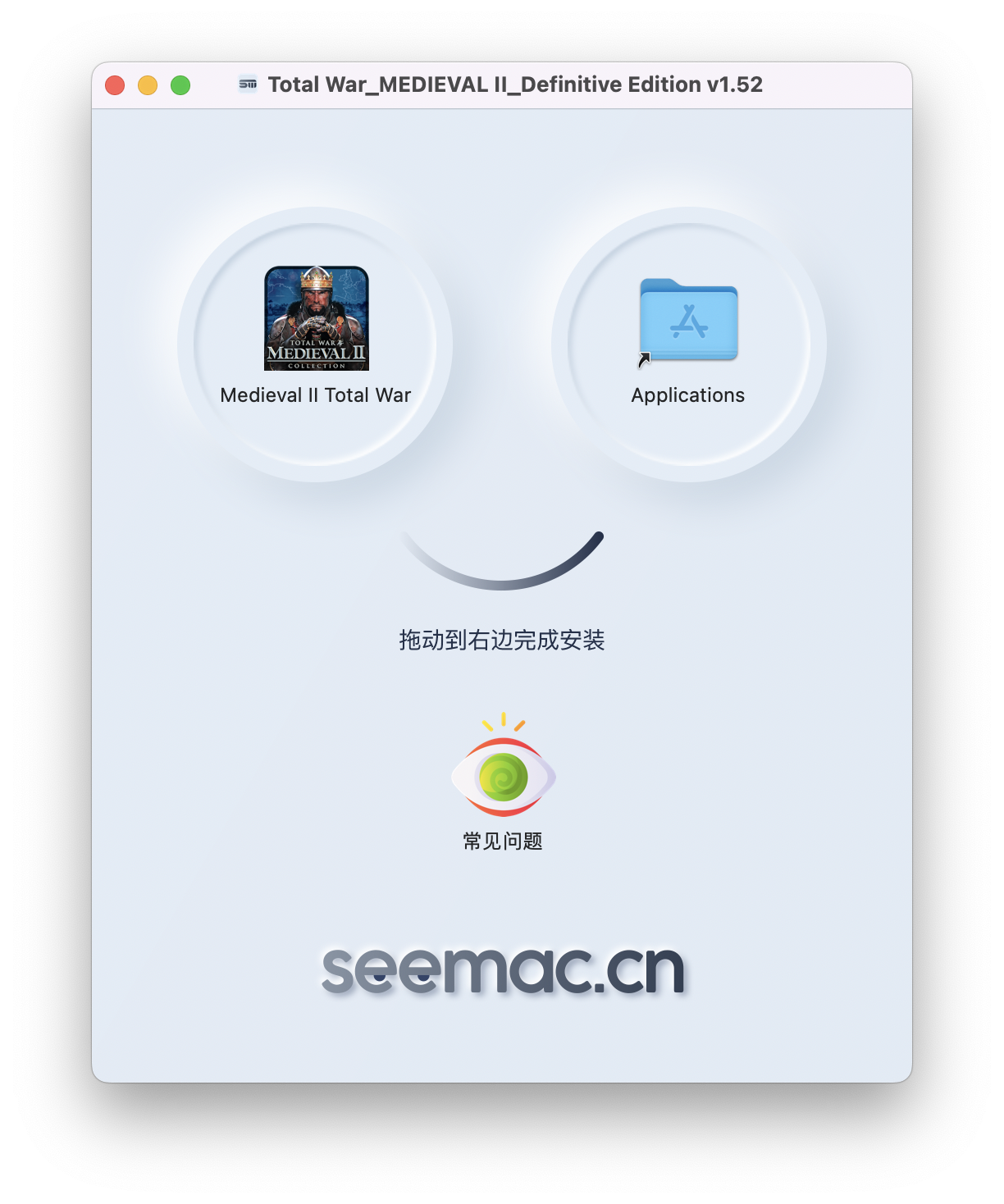 1.下载后打开文件,先将左侧 Medieval II Total War 拖动到右侧应用程序文件夹中完成游戏安装