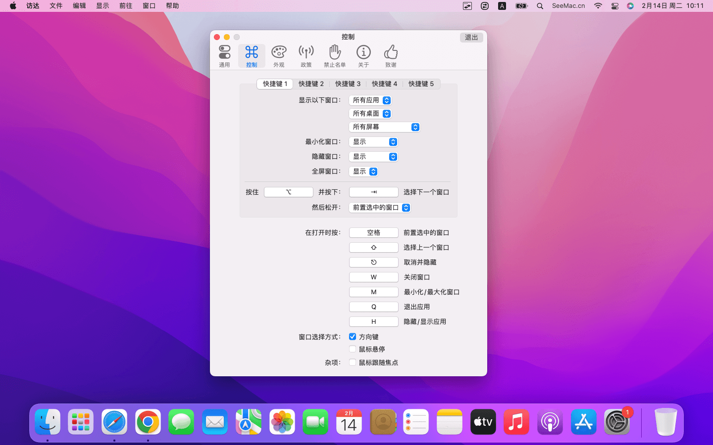 • 按住 ⌥ option + ⇧ shift 选择上一个窗口。