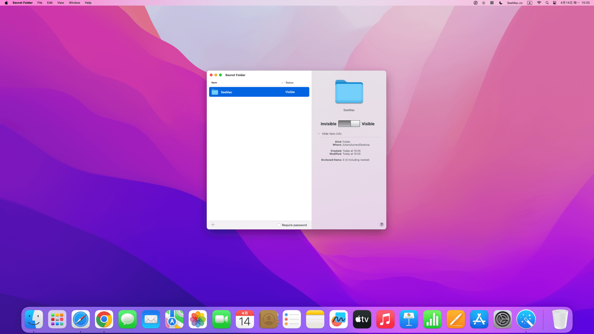 Secret Folder是一款mac文件以及文件夹隐藏工具,你只需单击一下即可隐藏Mac上的文件夹和文件。这款工具相对来说有点鸡肋,通过Secret Folder隐藏的文件是可以通过macOS的快捷键command + shift + .显示出来的,对于新手来说可以下载玩一下。