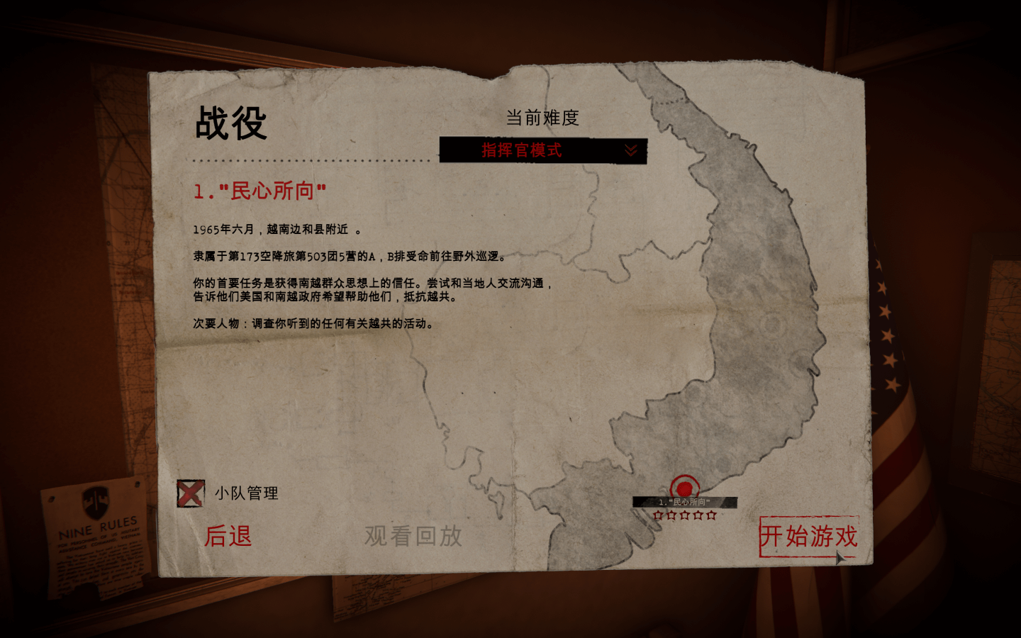 体验陷入血腥、混乱、道德模糊的越南冲突之中的士兵及其指挥官的故事。你还要面临诸如被困在战区的平民、中情局阴险的行动和令人头疼的政治压力的情境。游戏中还会出现越战中出现的经典桥段,比如野战排、合金弹头或者启示录。让自己在与越军的交火中做出正确的选择,实属不易。