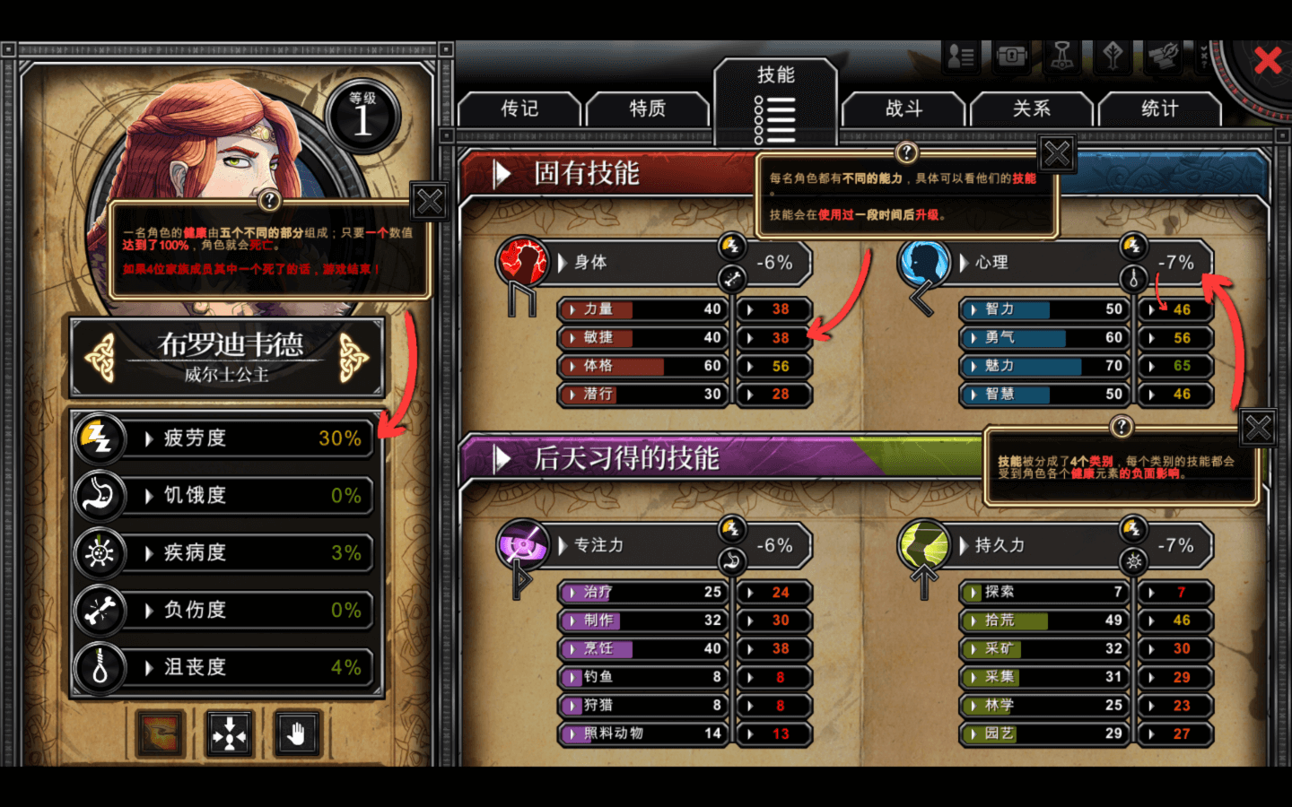 健康度分为五级,需小心照料;超过二十种可学习的技能,六百多种角色特质,上百种可收集道具,三十种疾病以及二十种致命伤残…