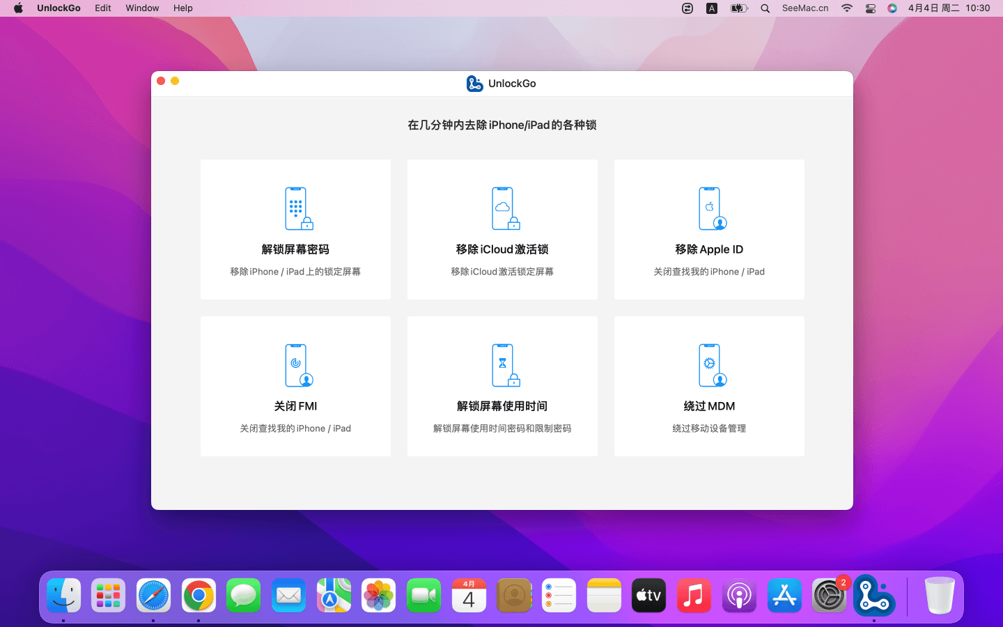 iOS设备解锁工具 软件介绍 iToolab UnlockGo 是Mac上一款具有解锁屏幕密码、移除iCloud激活锁、移除Apple ID、关闭FMI、解锁屏幕使用时间和绕过MDM功能的苹果设备解锁工具,UnlockGo只需要几分钟,就能够快速为您解决IOS设备的密码遗忘、设备被禁用、脸部/触控ID不可用、密码已过期等问题!