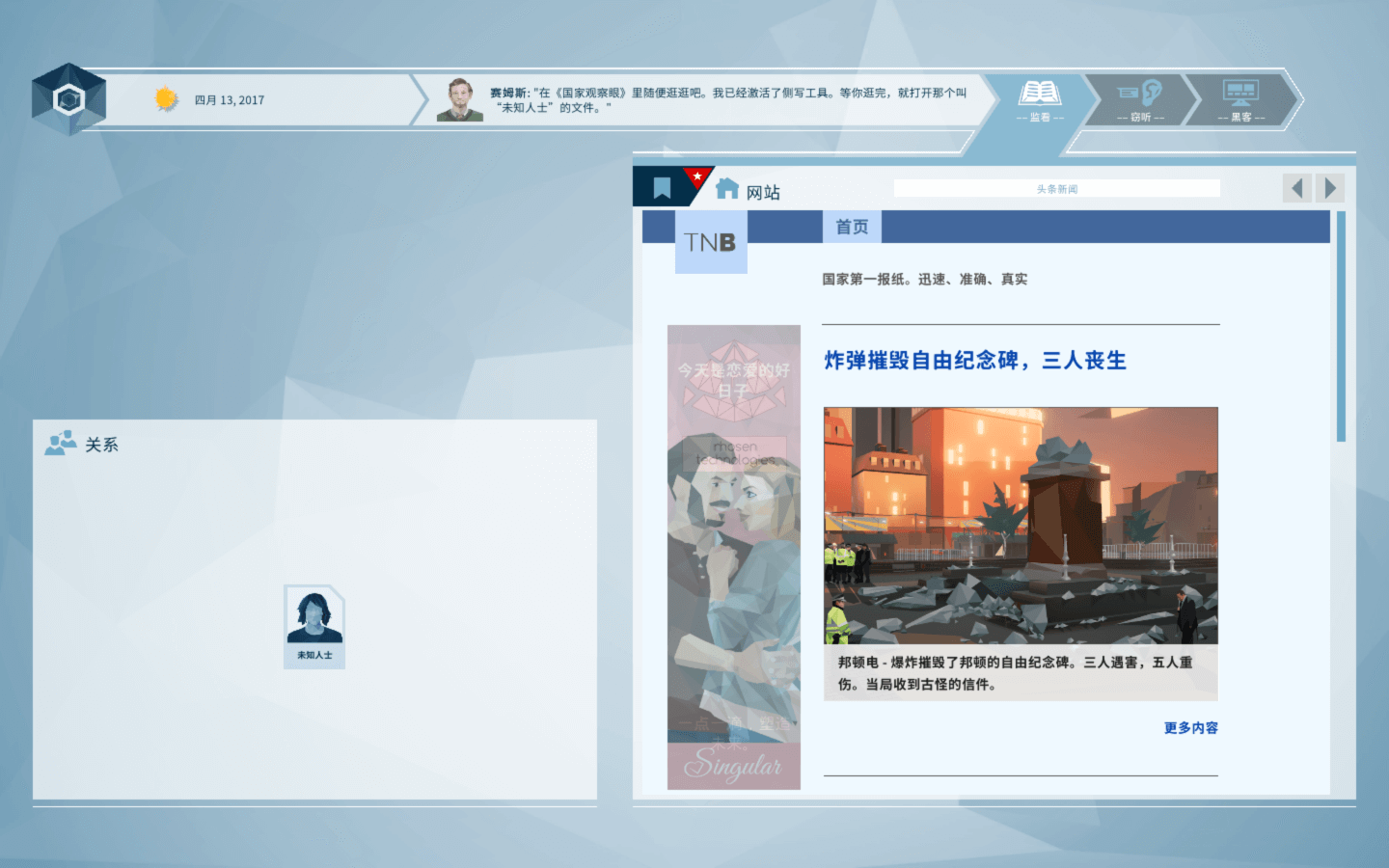 经过千挑万选,你从成千上万名申请人中脱颖而出,被选为奥威尔的第一名人类调查员。当一次恐怖袭击震动国家首都邦顿时,奥威尔和你立即被投入测试。先从单个嫌疑人开始,你将帮助安全部门构建一个潜在罪犯网络。