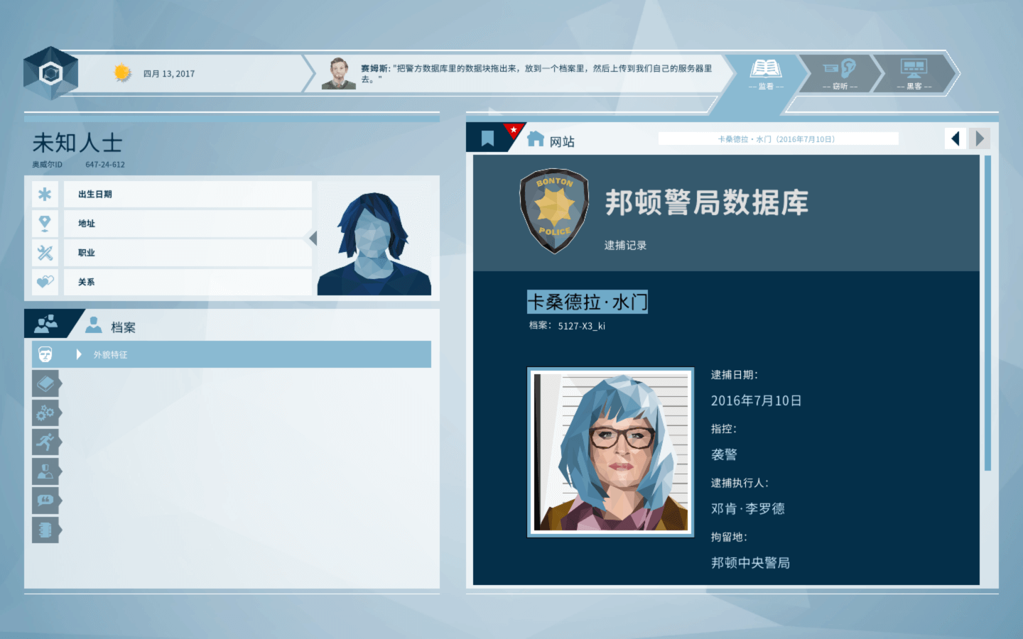 - 决定信息的关联性。只有你提供的信息才会被安全部门看到并以此行动。由你决定信息的可见与不可见,继而影响安全部门对嫌疑人的看待方式。