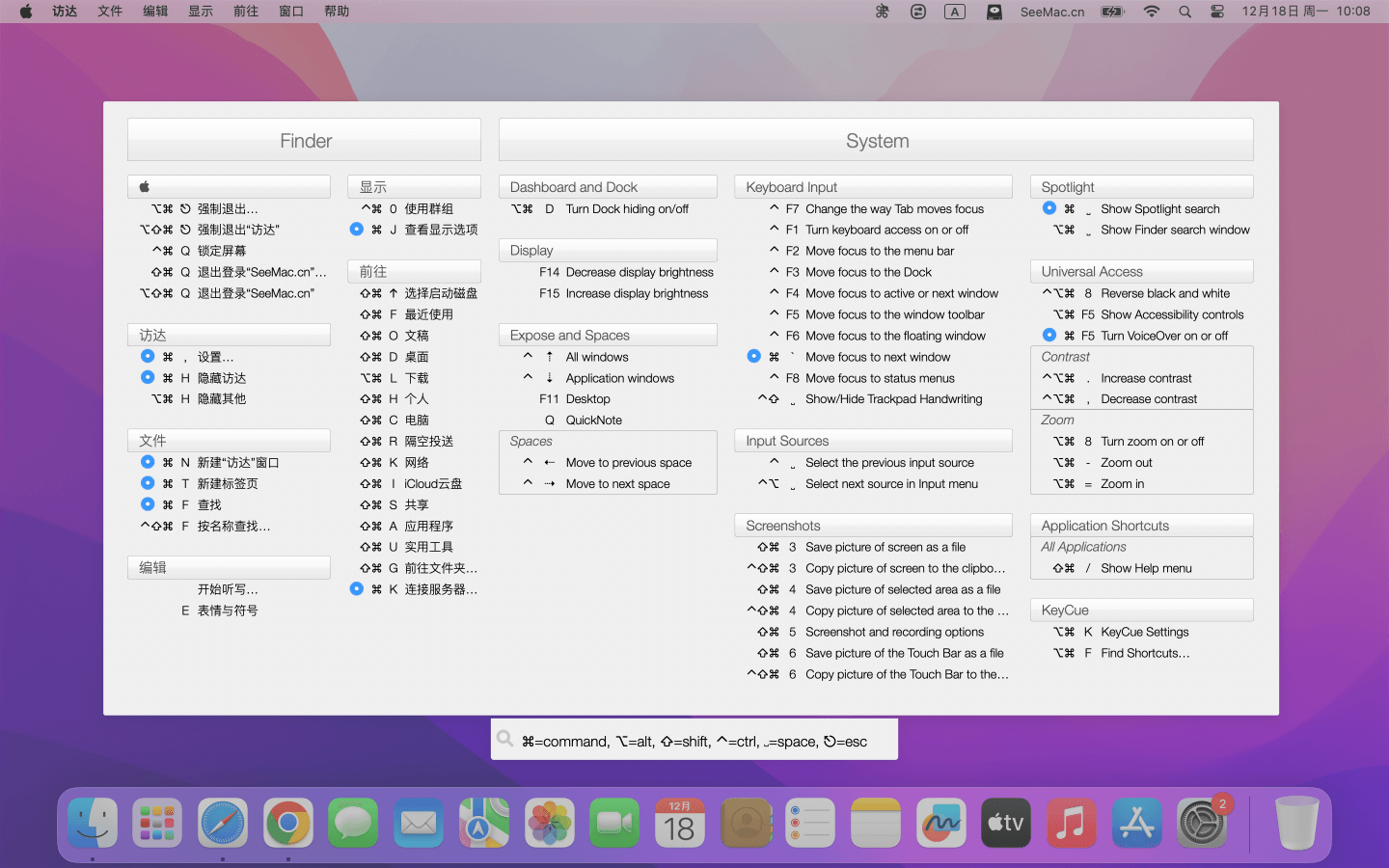 KeyCue for mac 中文破解版是mac上一款好用的键盘快捷键提示工具,KeyCue主界面一个Mac快捷键大全面板,该面板列出了当前活动应用所有支持的键盘快捷组合键。这样,您就能够更快地记住它们。KeyCue是一款提高您的工作效率以及Mac新手的必备工具。