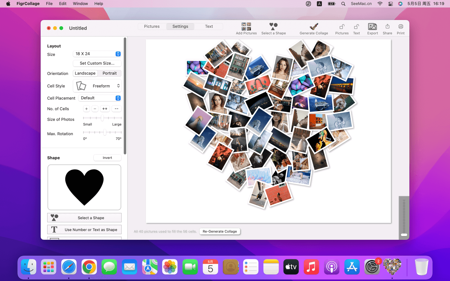 将照片拼成任意形状的照片墙 软件介绍 FigrCollage 是一款适用于mac的图片墙制作软件。可以将图片生成任意形状的照片拼贴。比如您可以导入多张照片制作心形,圆形,正方形或任何其他形状的照片墙。你甚至也可以直接输入汉字、字母、单词生成图片墙!