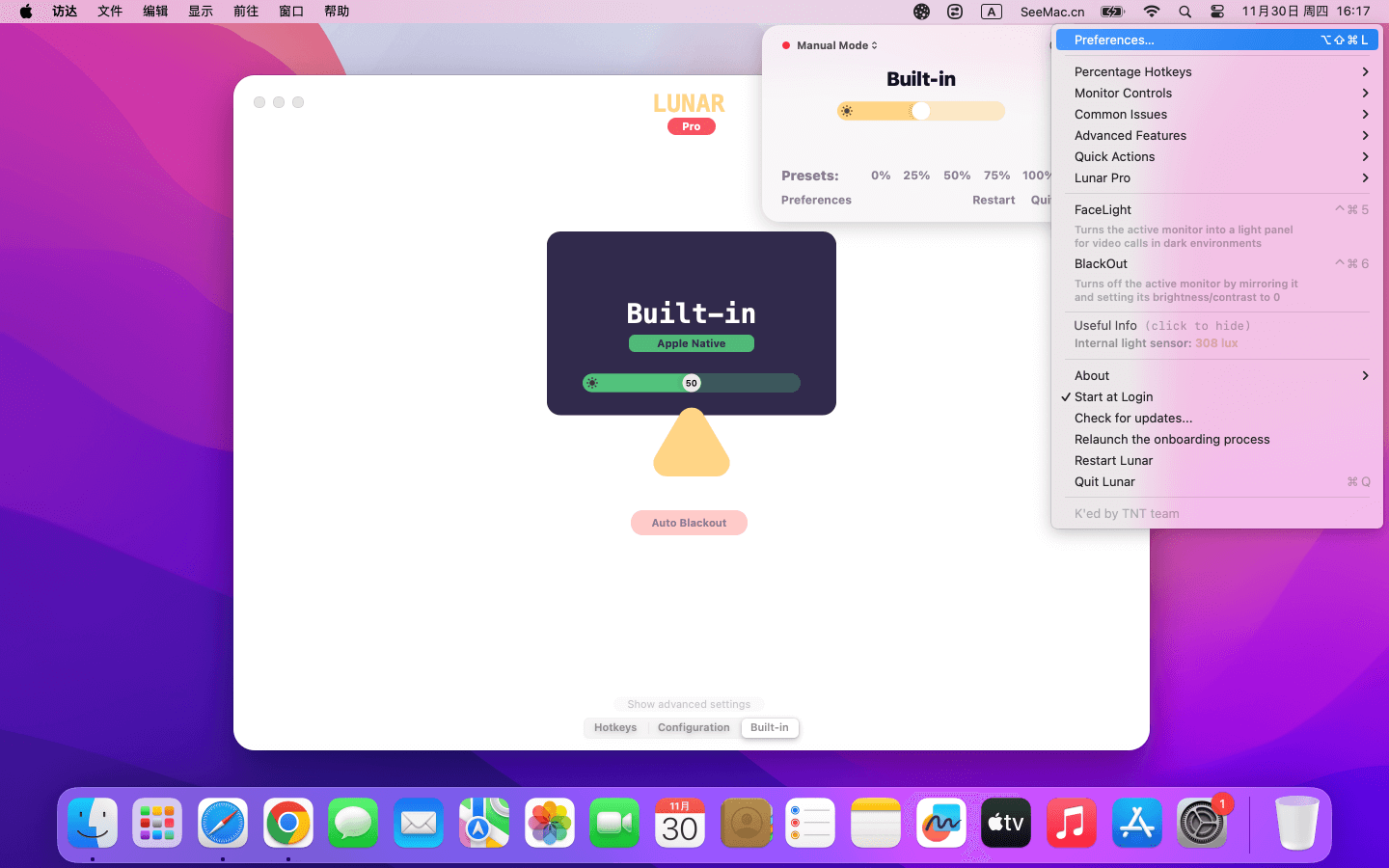 Lunar Pro 是一款适用于 macOS 的外接显示器亮度和显示器音量调节工具。与其他仅通过在屏幕上添加黑色覆盖层来模拟亮度变化的软件不同, Lunar 使用 DDC(显示数据通道)向显示器发送类似 set brightness to 30% 或 switch input to HDMI 2 命令来实现。这使演色性更接近现实,消耗更少的功率并最大限度地减少背光渗色效应。