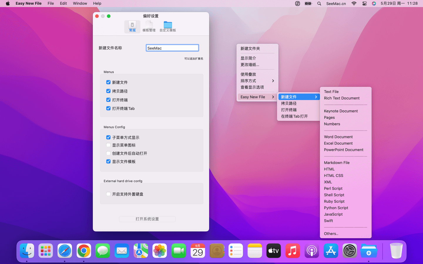 Easy New File为macOS右键菜单增加新建txt、新建doc、新建xls等的功能(可以创建自定义新建模板),还可以快速的进行拷贝路径、打开终端等操作。
