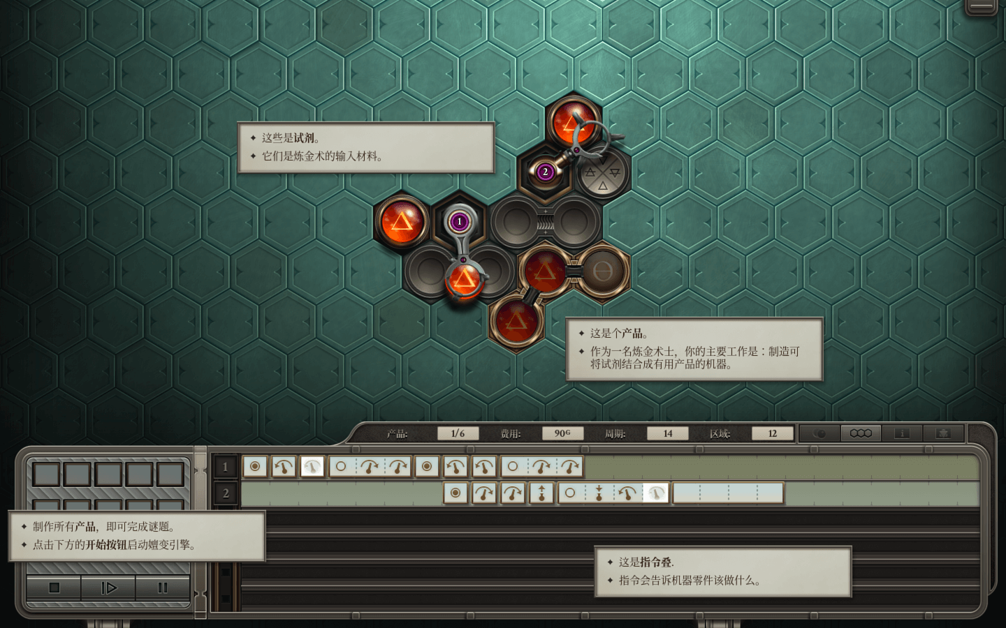 玩家使用可编程的机械臂、可自定义的轨道以及更神秘的设备,如范贝罗之轮和泛灵之符,来设计和建造进行炼金过程的机器。