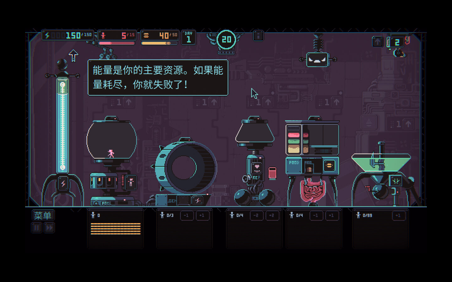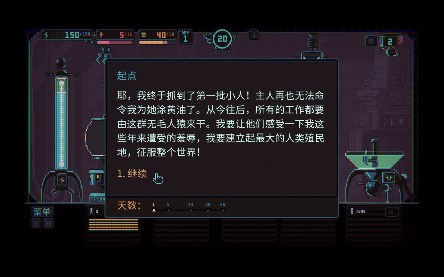人类已经被人工智能奴役……真是可喜可贺,因为我们站在正确的一方。通过剥削人类来榨取能量吧,利用这些小人建设属于你的帝国!你只需要稍微留意人类的状况,确保他们不会死于疲惫与饥饿……不过弱者注定要被扔进生物反应器。