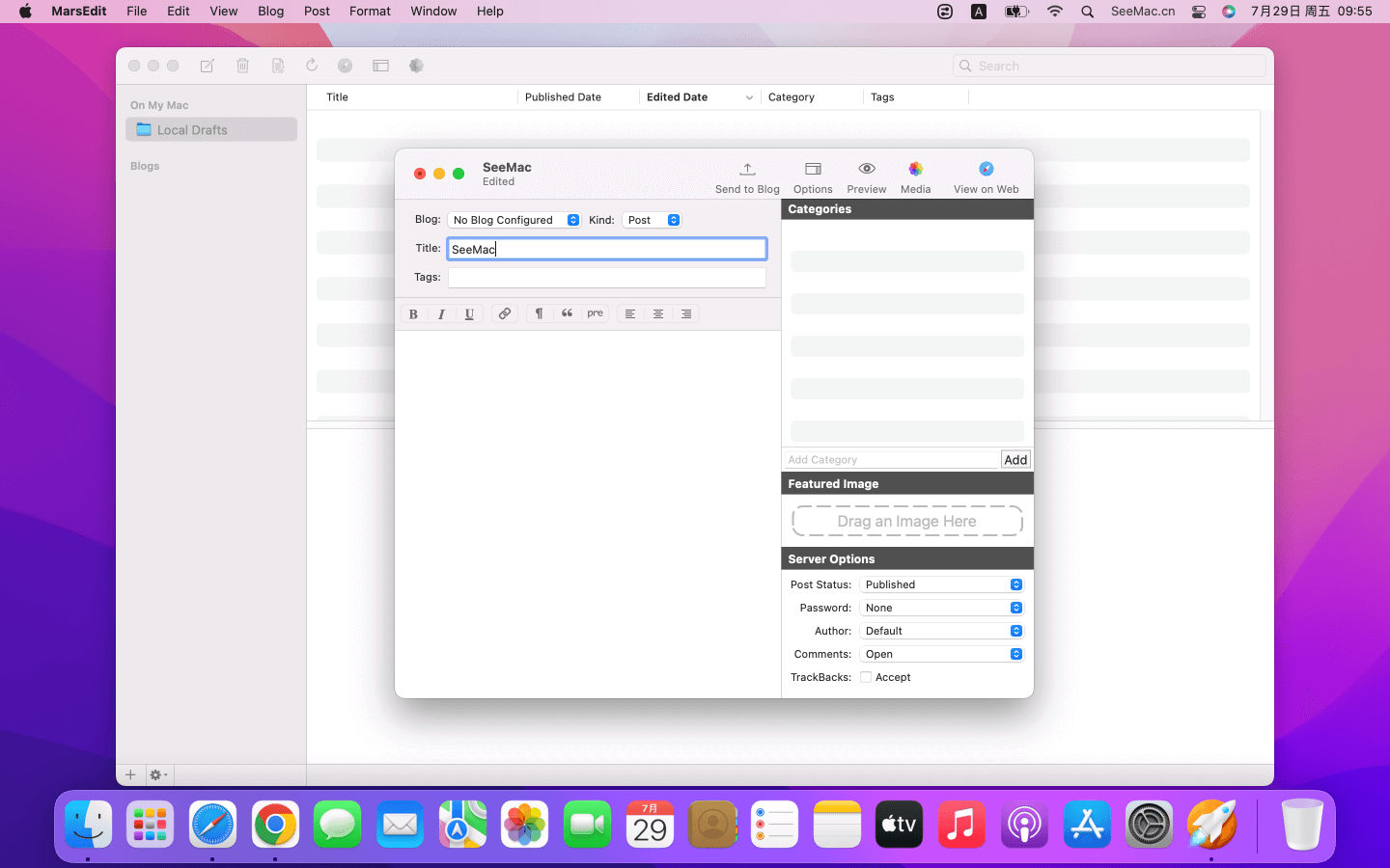 MarsEdit是Mac os平台上的一款博客写作软件,MarsEdit支持离线管理几乎所有的blog,包括WordPress、Blogger、Movable Type等数十种类型的博客网站,支持实时预览,提供了图文混排的编辑功能,图片等媒体文件一键即可轻松插入。