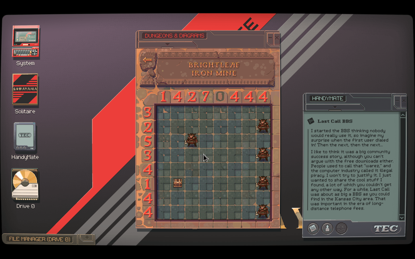 启动你的Z5 Powerlance并拨号进入Zachtronics的最新力作Last Call BBS!“酒吧老板”在他的复古电脑上装了一整套益智游戏,供你下载和玩耍。完全无需担心复制保护的问题,它们都已经破解完毕,随时可以享玩!