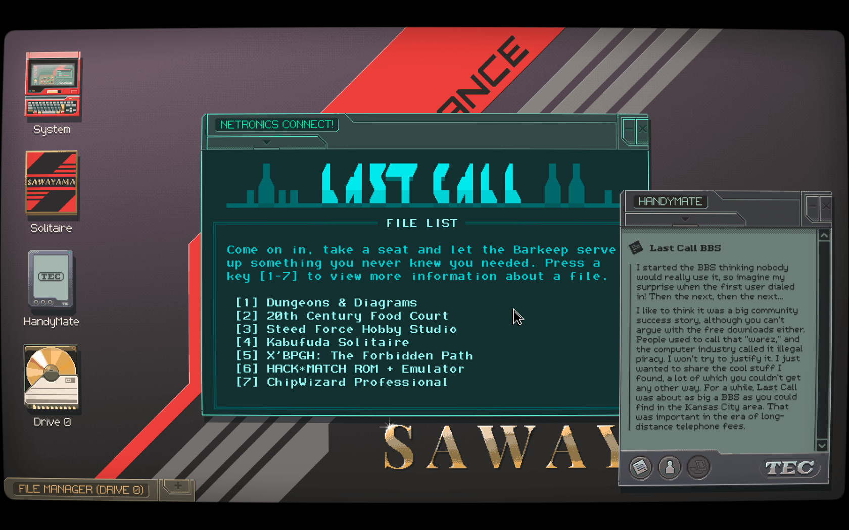 - 了解Last Call的神秘管理员“酒吧老板”以及游戏开发商和90年代传奇PC制造商Sawayama Corporation背后的故事。
