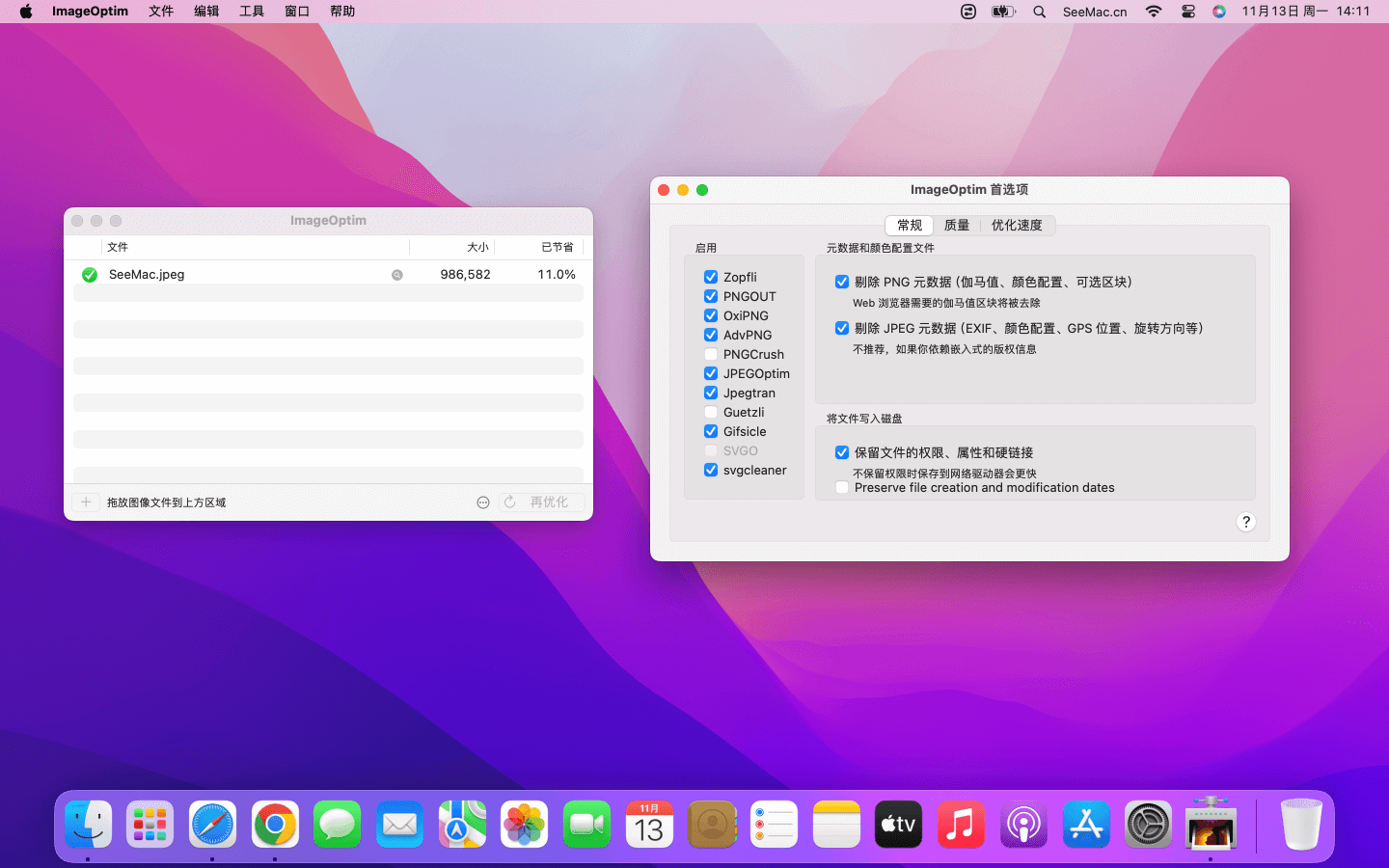图片压缩优化工具 软件介绍 ImageOptim 是一款开源的图片无损压缩工具。虽然开源,但是功能确非常强大。它无缝整合了当今世界上最好的图像优化工具:MozJPEG,pngquant,Pngcrush,7zip,SVGO和谷歌Zopfli,帮助您压缩您的图像。支持设置是否删除臃肿的的图像元数据,设置压缩质量、设置压缩速度。