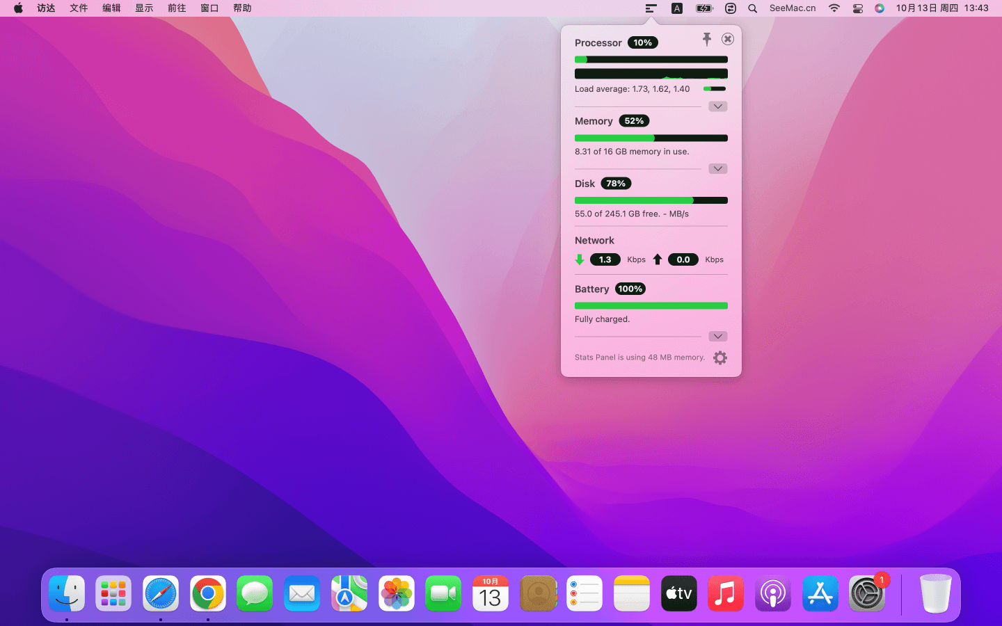 系统状态监控工具 软件介绍 Stats Panel 是一款运行在菜单栏的系统状态监控工具,你可以随时查看CPU运行状况、内存信息、磁盘使用情况、电池健康状况、网络上传和下载速度等,使用便捷 CPU监视器(百分比,时间轴,平均负载和核心数) 内存监视器(百分比,总数和类型计数) 磁盘使用情况(百分比,总计和读写速度) 网络监视器(上传和下载速度) 电池健康状况(百分比,估计的剩余电量,周期和健康状况) 可自定义的颜色 启动时启动选项 低动画模式以节省电量 针脚系统监控器