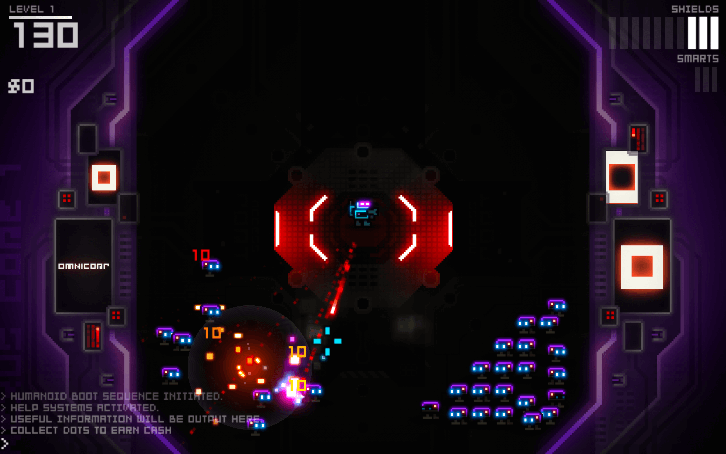 《电子射手》是一款很好玩儿的射击小游戏,游戏讲述了人类已经被邪恶的机械敌人所灭亡,你的任务是为人类而报复,避开猎人、小塔、布雷舰、炸弹和子弹的攻击,消灭邪恶的四大元凶 Leiunitas 、Bellum 、Lues 和 Letum! 你将在此过程中获得更强大的力量。《电子射手》游戏中简单明快的电子风格游戏画面令人回忆起街机时代的快乐,色彩绚丽的光影效果和看似奇怪却极富个性的角色设计也让游戏更具吸引力。游戏的音乐可谓游戏的一大成功之处,不仅凭借音乐得奖,游戏音乐的出色效果令游戏进行更加有趣,让人欲罢不能。