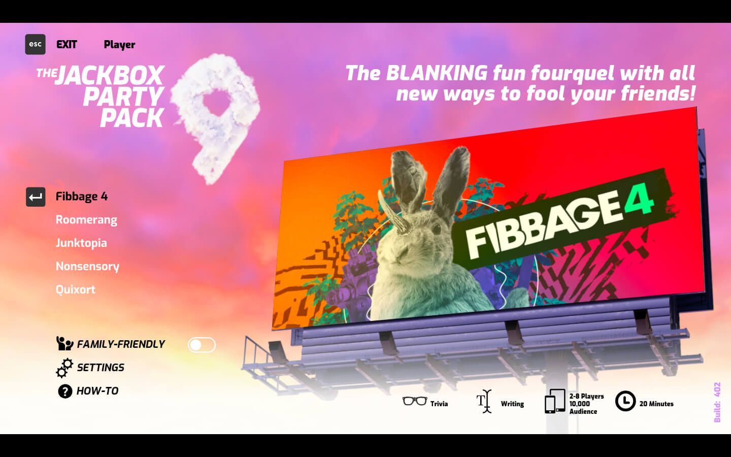 (2 至 8 名玩家)热闹的“虚张声势”排队游戏以全新的 Final Fibbage、视频问答、粉丝问答和 Fibbage Enough About You 模式回归!这是一款深受喜爱的游戏,我们决定推出它的第 4 代。
