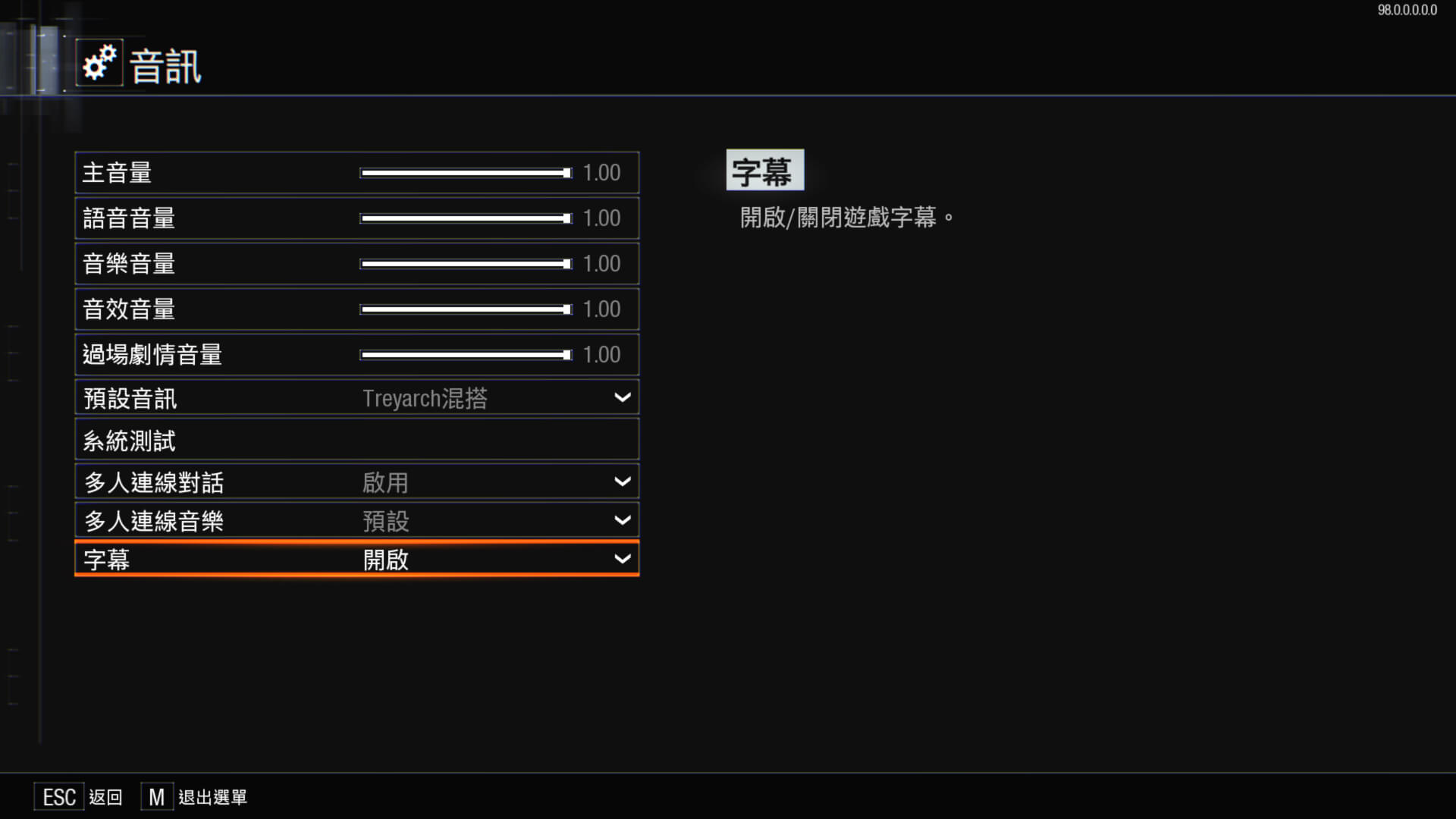 - 如果没有字幕,在「游戏选单 -> 选项 -> 音讯」里开启(如截图)