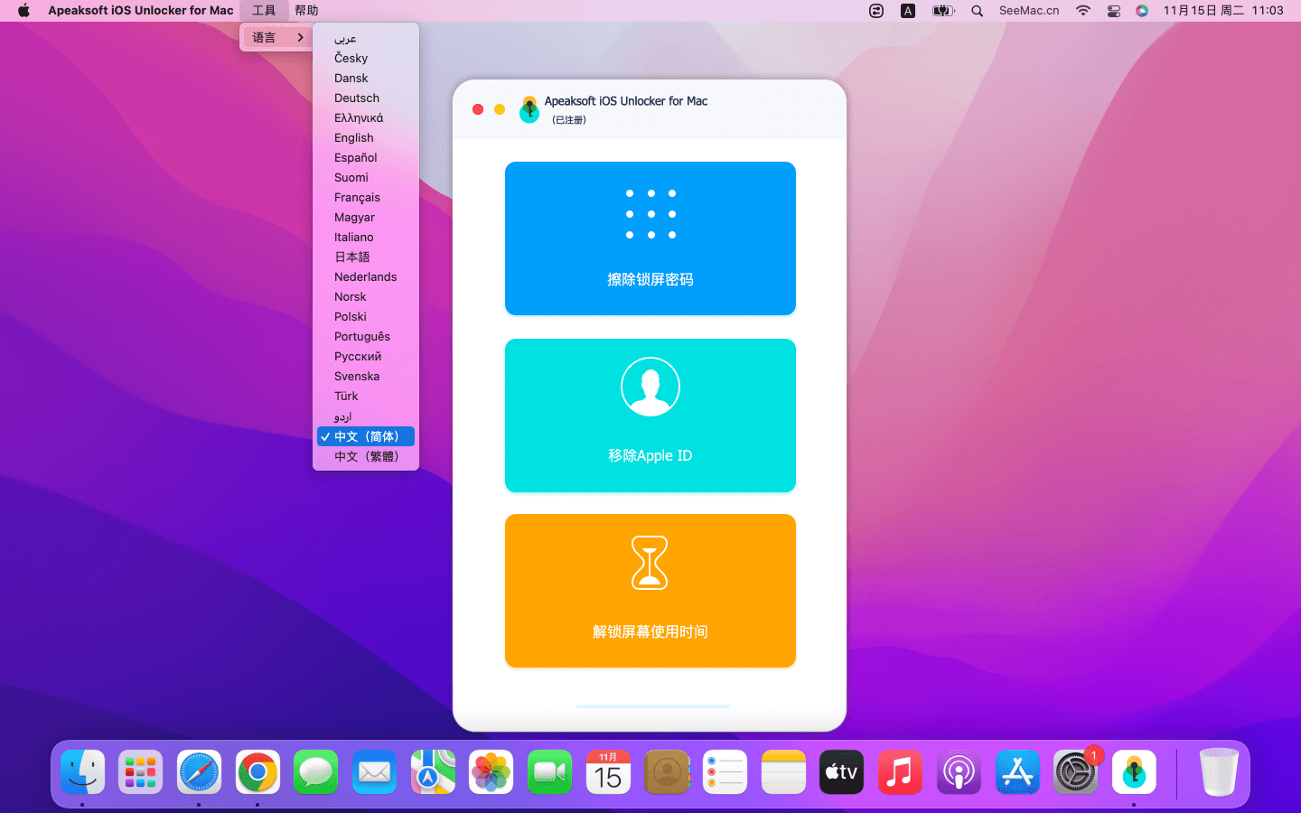 ios设备解锁软件 特别提醒:打开软件后,在顶部菜单栏 Tools -> Language里切换中文 软件介绍 Apeaksoft iOS Unlocker 能够帮助用户擦除 iPhone 密码以进入屏幕锁定设备,删除忘记的 Apple ID 以将 iPhone 激活为新的或者恢复并删除屏幕时间限制密码的ios设备解锁软件一款ios设备解锁软件,只需通过USB 数据线将锁定的 iPhone 连接到计算机即可快速完成操作!