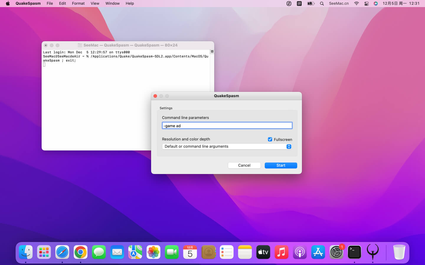 特别提醒:安装好游戏后,在应用程序里打开「Quake」文件,双击「Quake」启动游戏