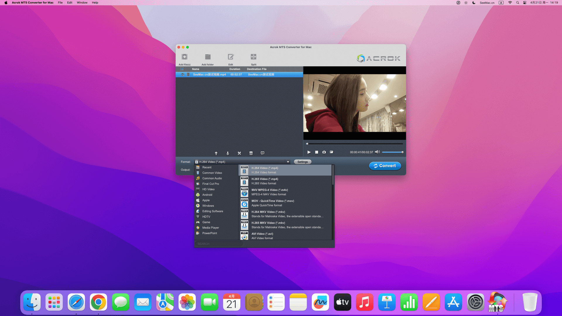 Acrok MTS Converter for Mac是一种专用的Mac MTS转换器,它提供了一种简单的方法,可以在Mac OS上将AVCHD,MTS,M2TS,TS文件转换为MOV,M4V,MP4,AVI,MPEG,WMV和其他高清视频格式。借助这款功能强大的MTS Converter Mac,您还可以将AVCHD,MTS,M2TS文件转换为优化的编解码器和格式,以在Mac上编辑软件,例如适用于Final Cut Pro(X)的Apple ProRes编解码器,用于iMovie的Apple InterMediate编解码器(AIC)编解码器,用于Avid Media Composer等的DNxHD编解码器,或将MTS视频转换为Adobe Premiere Pro,Adobe After Effects,Apple Aperture,QuickTime,iTunes等的最佳格式。您还可以将MTS视频转换为便携式设备进行播放,例如Apple iPod, iPod mini,iPod Air,iPhone,Android平板电脑,Android智能手机等。
