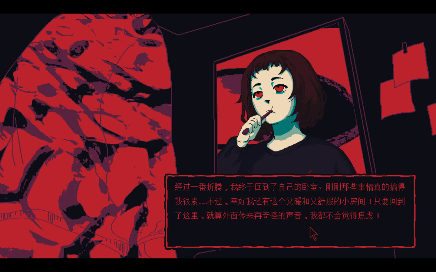 - 非写实风格的像素图形画面,反映了小女孩对世界扭曲的认知。