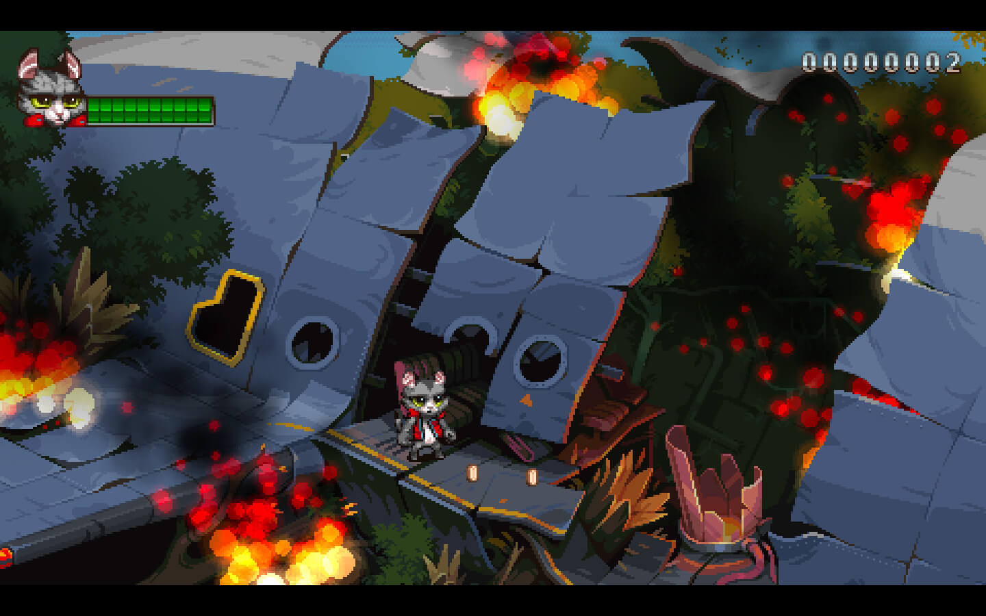 来见见超级猫猫哥,他可不是一般的汤姆猫!他和他疯狂的搭档武器女孩一起,在试图挫败邪恶创造者的阴暗计划时,不闻其声空留狼藉。他全副武装,并配备了最时髦的滑板鞋技术。他必须奔跑、跳跃、冲刺、攀爬、射击,并在成群的拟人化狗狗兵团中杀出一条血路。如过你喜欢80年代和90年代、喜欢16位平台游戏、喜欢郎朗上口的曲调、喜欢“强大的”Boss战、喜欢猫咪,讨厌狗狗(开玩笑啦,我们超爱狗勾的)。那么你就会乐在其中。