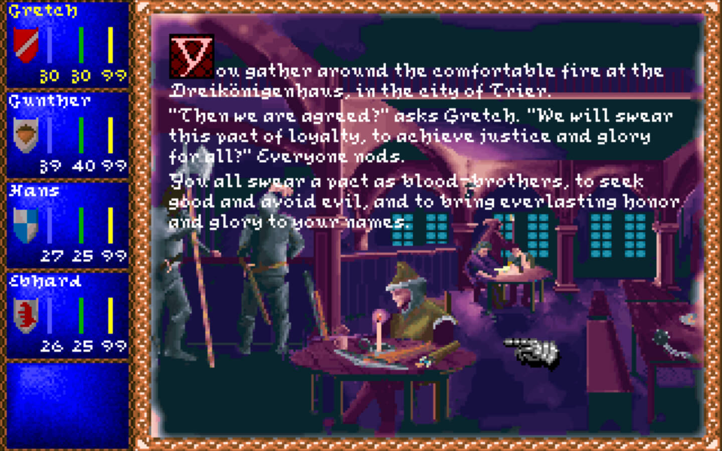 在黑森林的暮色中,你和你的同伴们蹲在强盗骑士的塔前。炼金术士汉斯把他的神秘药水放在门边。修士埃布哈德恳求圣邓斯坦保佑你们的武器和盔甲。你和格雷琴握紧赤裸裸的长剑,祈祷你的板甲不会吱吱作响。