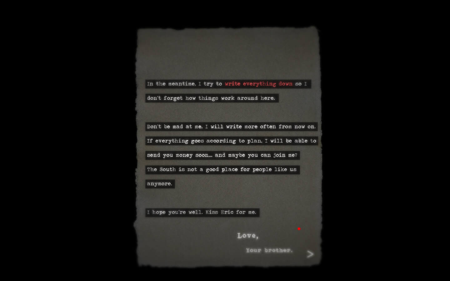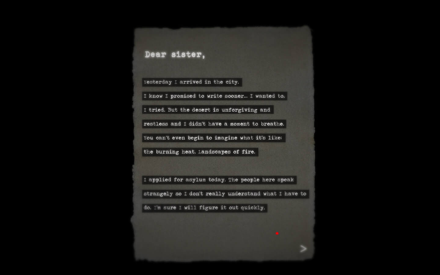 游戏玩法非常简单,主要包括探索和简单的解谜。主要的难度在于理解你为了获得庇护应该做什么。你来自南方的一个外国地区,感到迷失和困惑——这种困惑你通过写给国内妹妹的信来表达。作为游戏的一个重要部分,这些信件帮助你理解你的任务,同时推动游戏的叙事。
