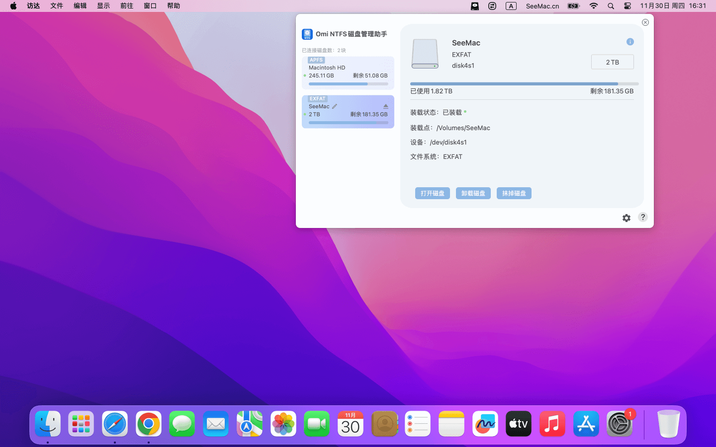 NTFS磁盘读写管理器 软件介绍 NTFS Disk by Omi 是Mac上的一款NTFS磁盘管理器。使用NTFS Disk by Omi,你可以轻松地在Mac上读写Windows NTFS磁盘的文件。支持在Mac上修复和格式化NTFS磁盘。