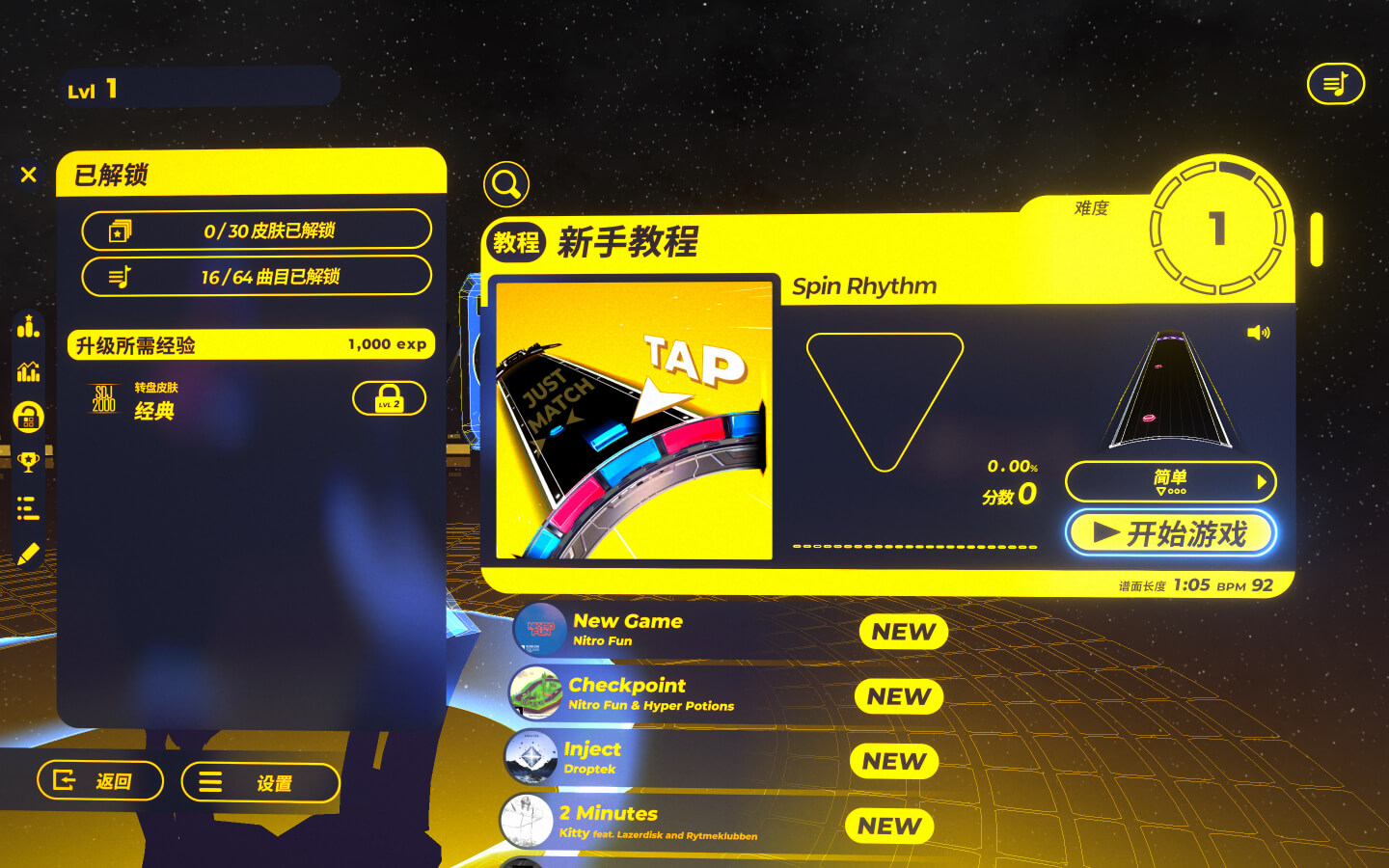 旋转节奏XD Spin Rhythm XD for Mac v1.7.0 中文原生版 休闲 2025-11-12 15 👍 好几把炫酷的音游!甩狙练习器 游戏介绍 进入节奏次元。通过旋转,点击,轻弹和滑动全球最棒的节奏将颜色和节拍合在一起。《旋转节奏XD》是一款电音音乐游戏,拥有惊艳的互动背景、精致的游戏关卡,以及流畅、律动的操作方式。