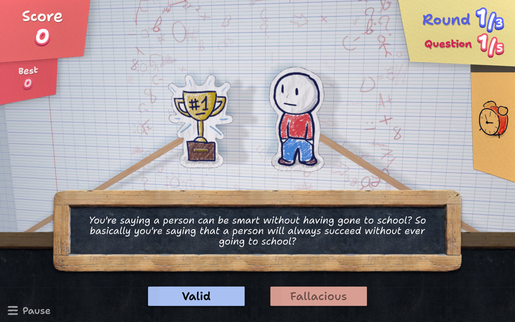 在游戏中,您将看到各种陈述,并要求您确定它们是否有效。在更难的关卡中,你需要找出所采用的具体谬误。您越快、越准确地识别每个谬误,您的分数就越高!