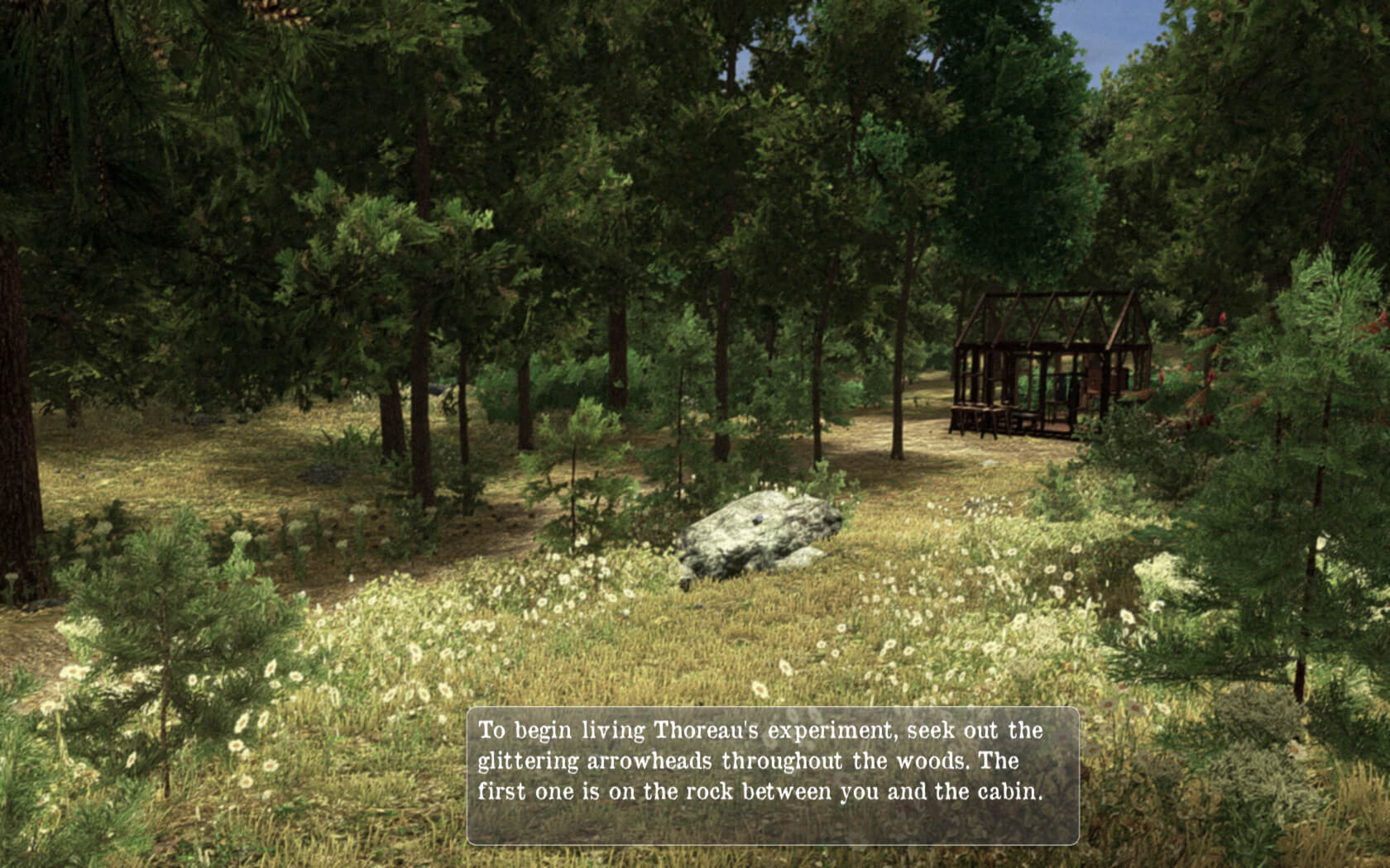 该作是一款 6 小时的叙事性游戏,故事始于 1845 年夏天梭罗搬到瓦尔登湖畔,在那里建造小屋。你将跟随他的脚步,寻找食物和燃料,以维持在森林中的生存。除此之外,你也被鼓励去探索森林和湖的美丽,它们会给你带来超越基本需求的崇高生活的希望。